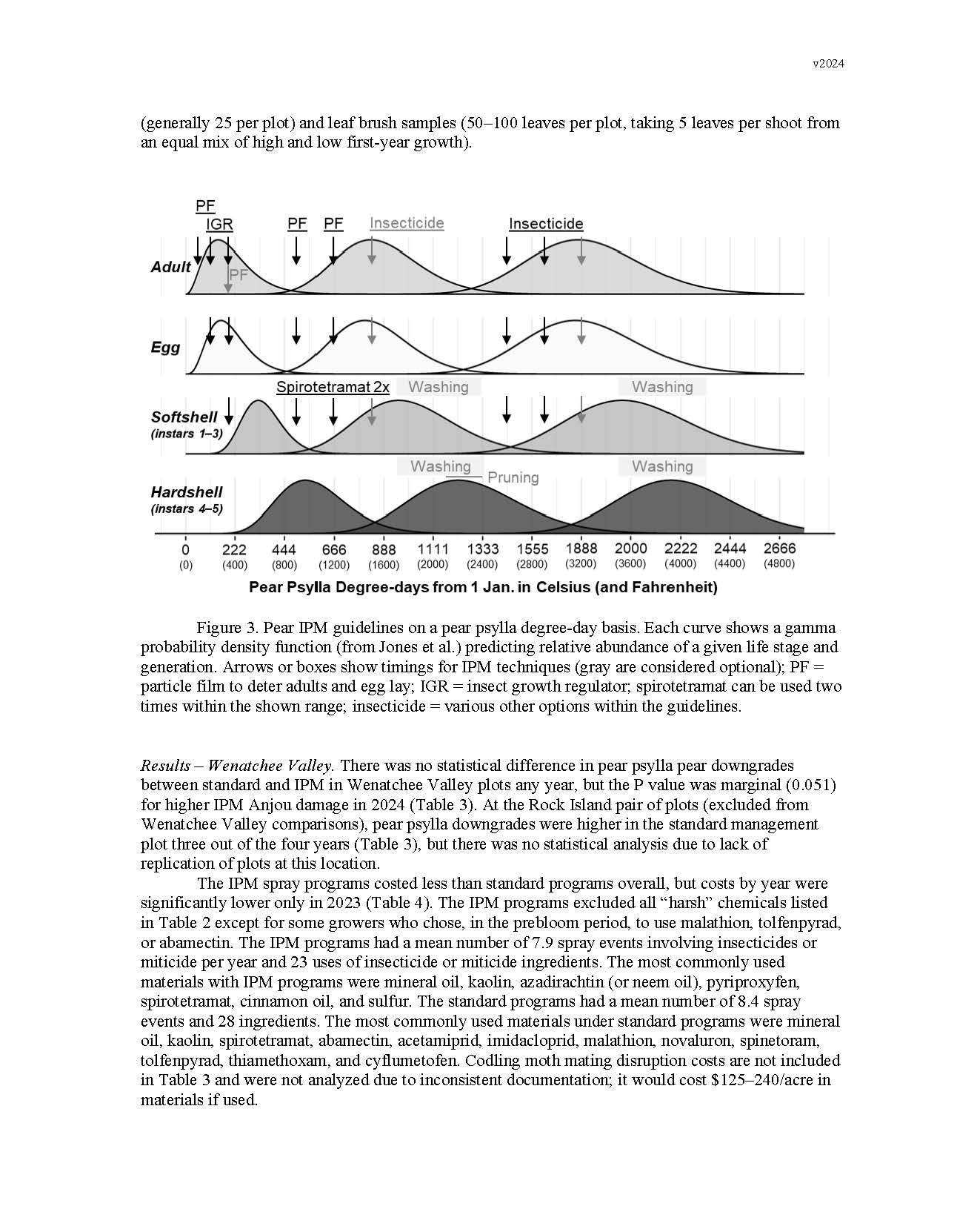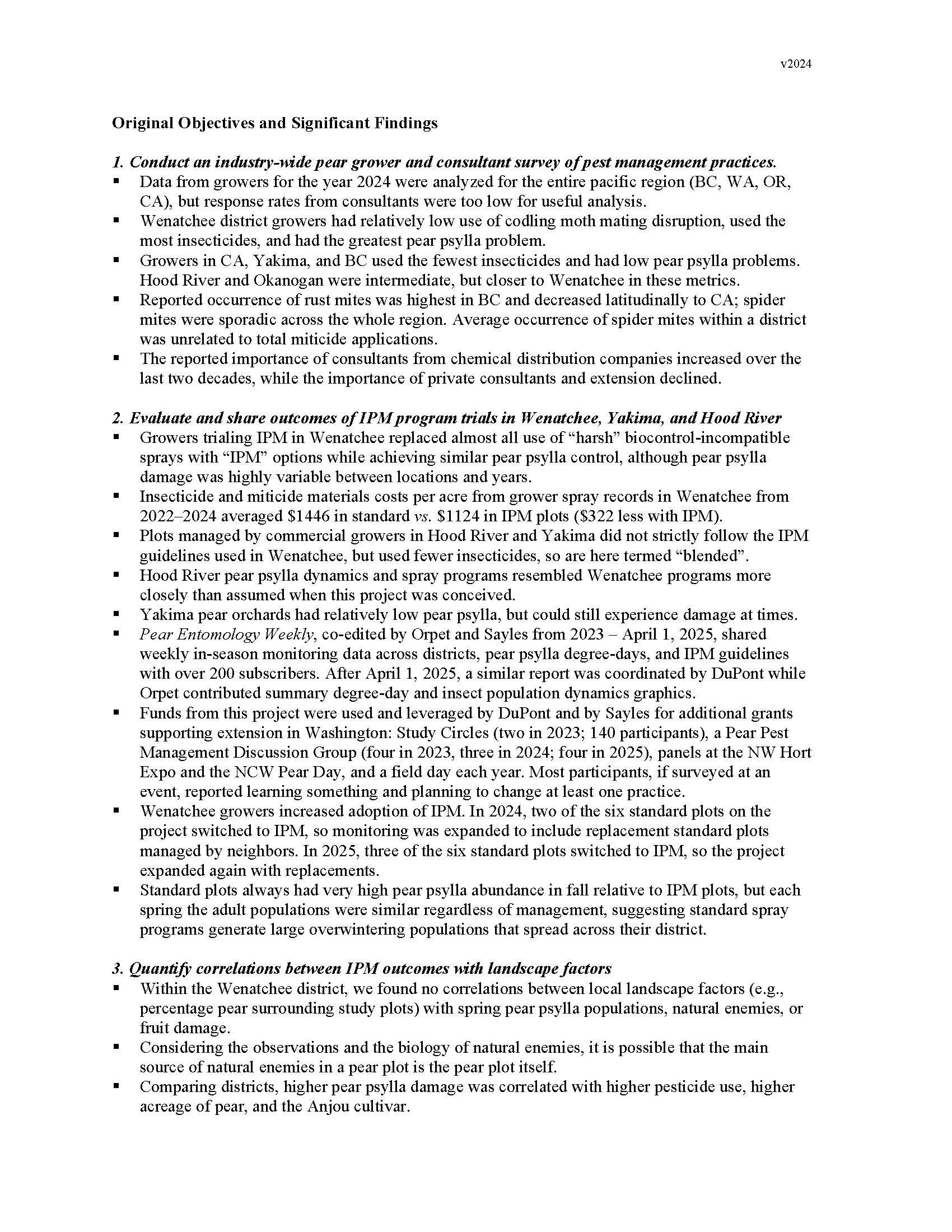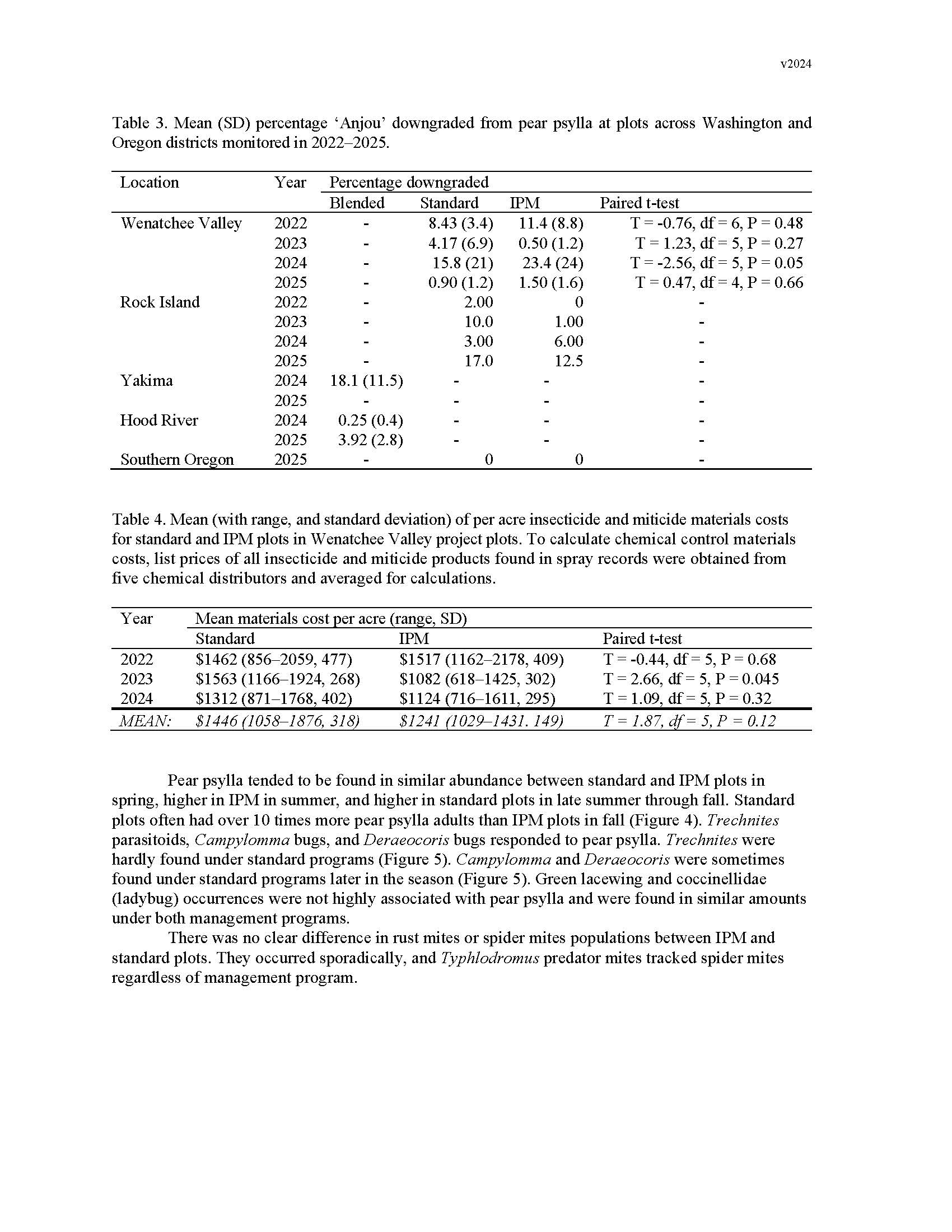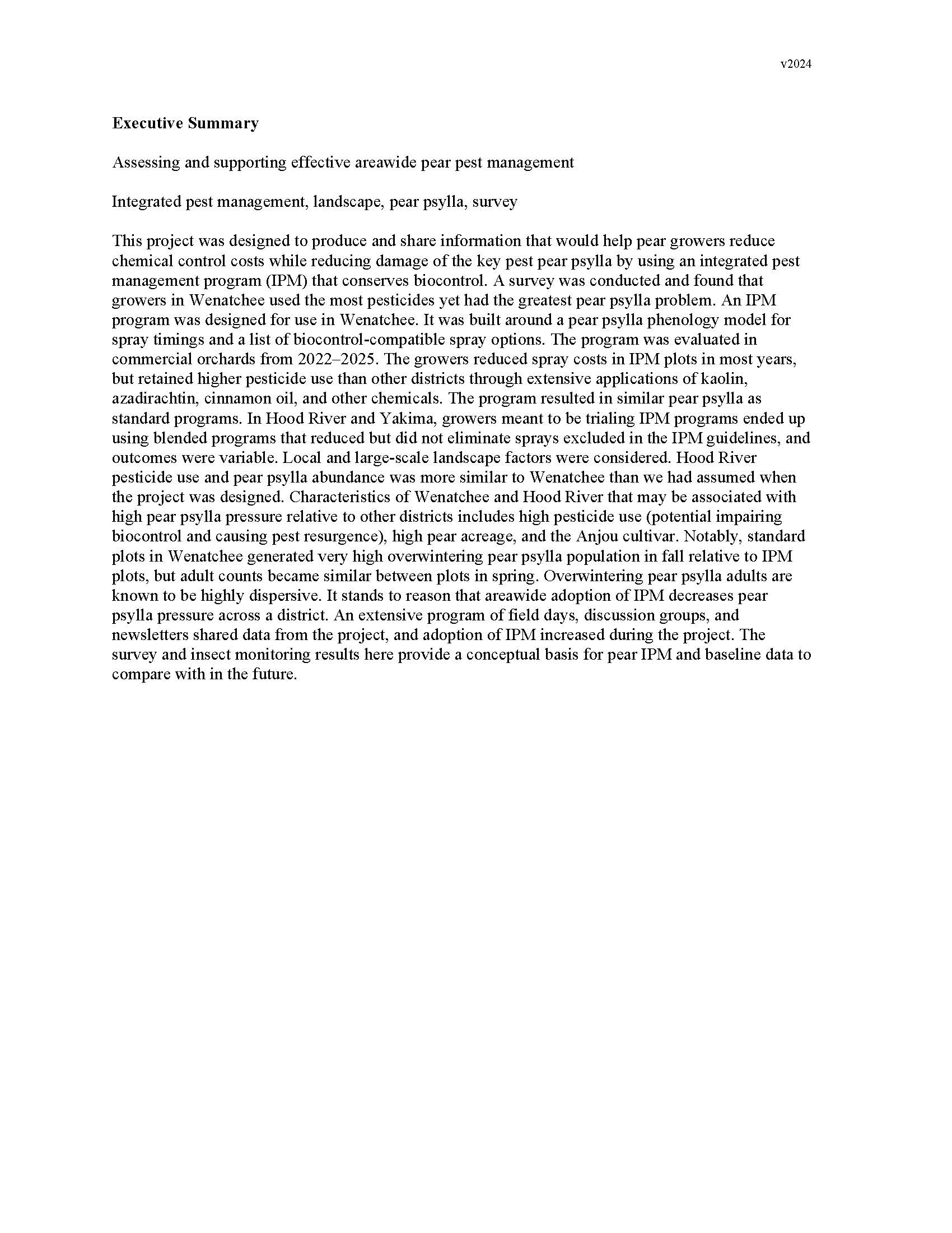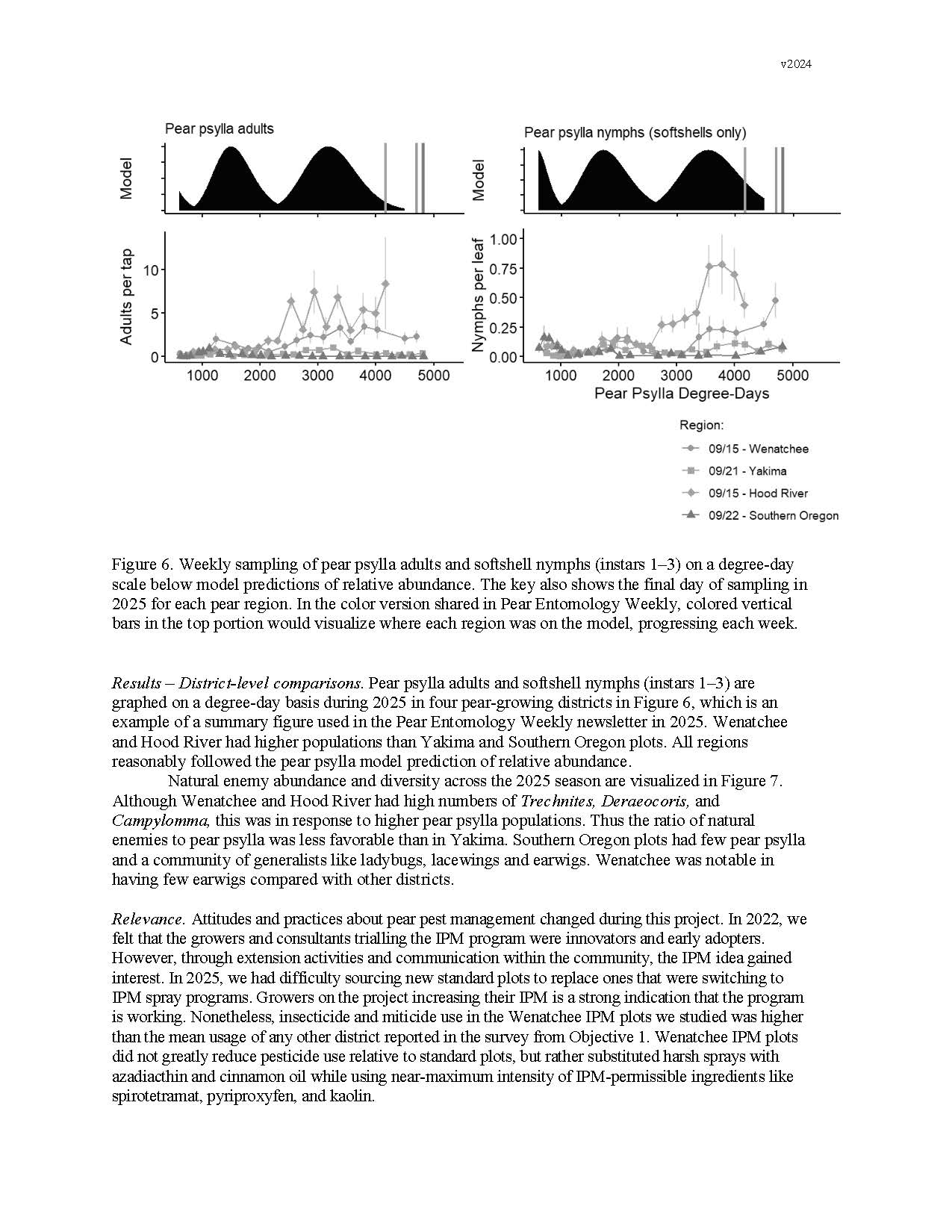 Summary: This project was designed to produce and share information that would help pear growers reduce chemical control costs while reducing damage of the key pest pear psylla by using an integrated pest management program (IPM) that conserves biocontrol. A survey was conducted and found that growers in Wenatchee used the most pesticides yet had the greatest pear psylla problem. An IPM program was designed for use in Wenatchee. It was built around a pear psylla phenology model for spray timings and a list of biocontrol-compatible spray options. The program was evaluated in commercial orchards from 2022–2025. The growers reduced spray costs in IPM plots in most years, but retained higher pesticide use than other districts through extensive applications of kaolin, azadirachtin, cinnamon oil, and other chemicals. The program resulted in similar pear psylla as standard programs. In Hood River and Yakima, growers meant to be trialing IPM programs ended up using blended programs that reduced but did not eliminate sprays excluded in the IPM guidelines, and outcomes were variable. Local and large-scale landscape factors were considered. Hood River pesticide use and pear psylla abundance was more similar to Wenatchee than we had assumed when the project was designed. Characteristics of Wenatchee and Hood River that may be associated with high pear psylla pressure relative to other districts includes high pesticide use (potential impairing biocontrol and causing pest resurgence), high pear acreage, and the Anjou cultivar. Notably, standard plots in Wenatchee generated very high overwintering pear psylla population in fall relative to IPM plots, but adult counts became similar between plots in spring. Overwintering pear psylla adults are known to be highly dispersive. It stands to reason that areawide adoption of IPM decreases pear psylla pressure across a district. An extensive program of field days, discussion groups, and newsletters shared data from the project, and adoption of IPM increased during the project. The survey and insect monitoring results here provide a conceptual basis for pear IPM and baseline data to compare with in the future.