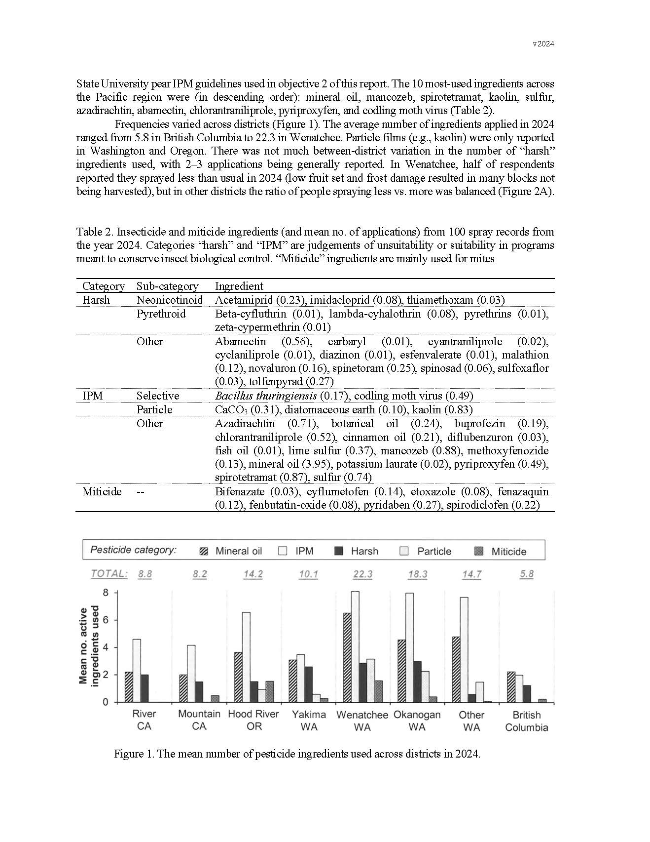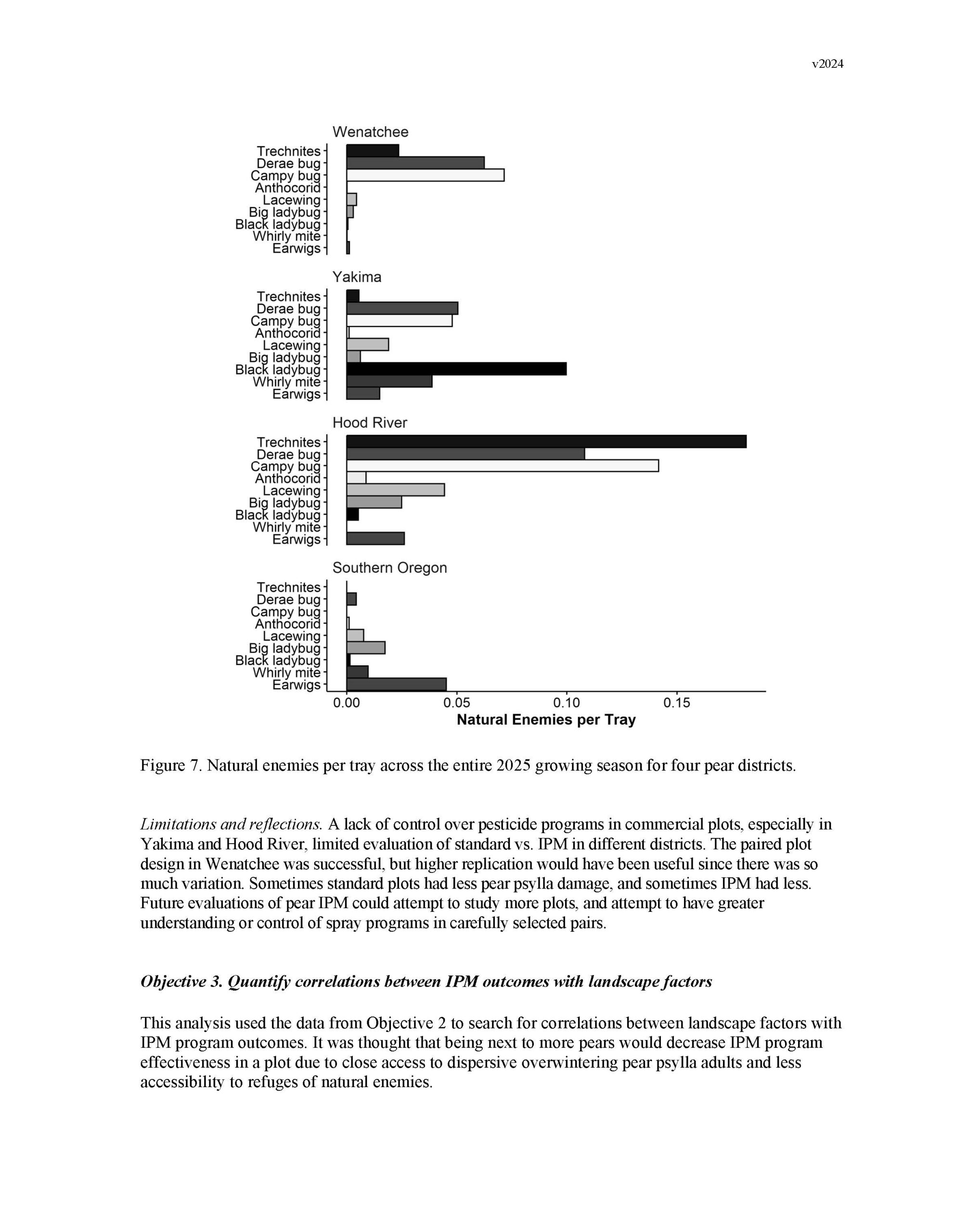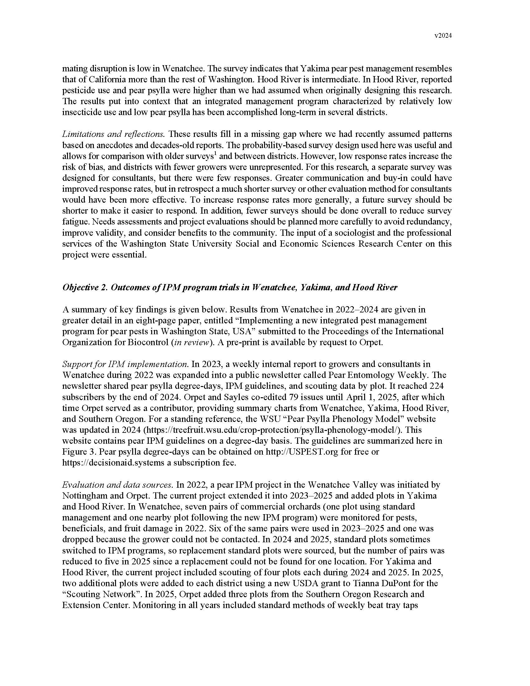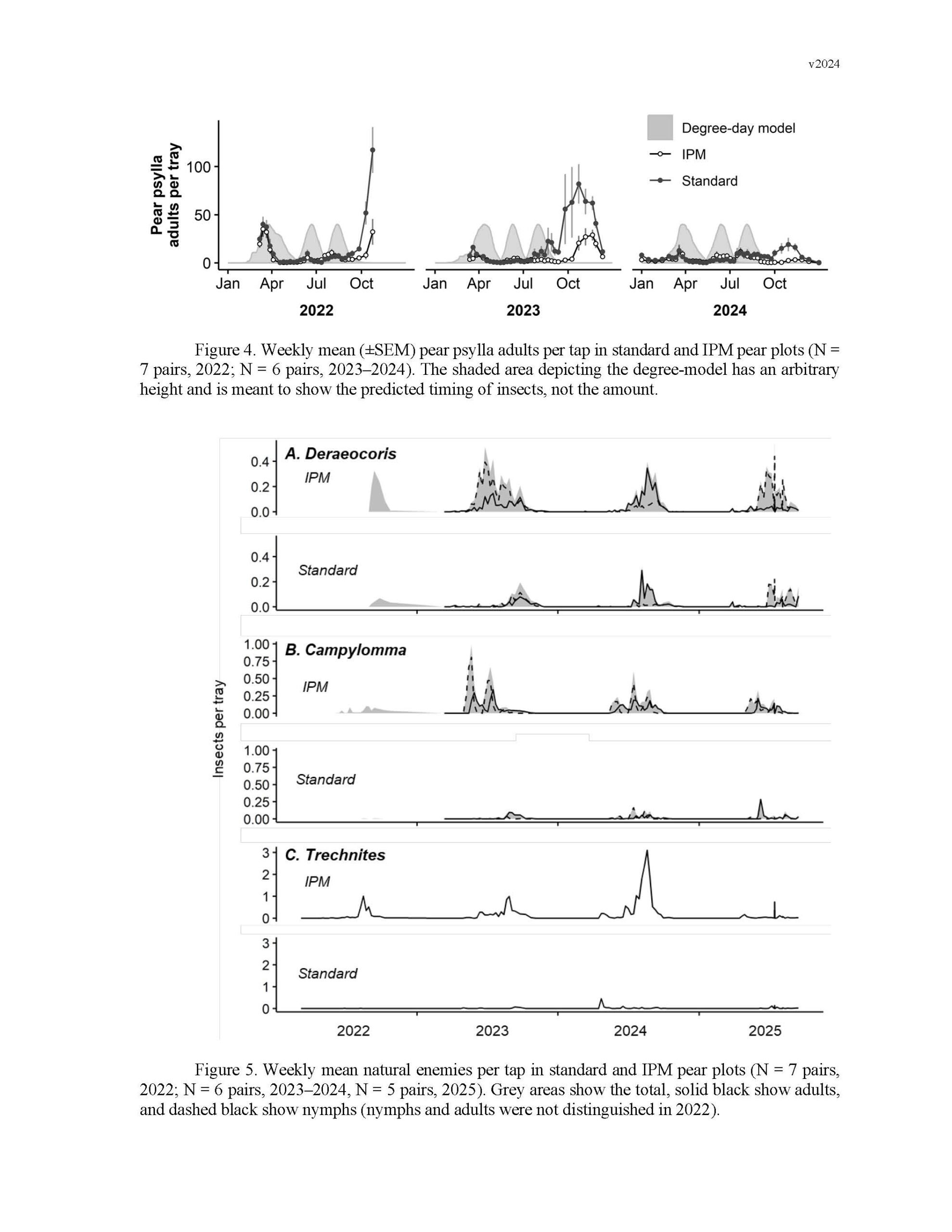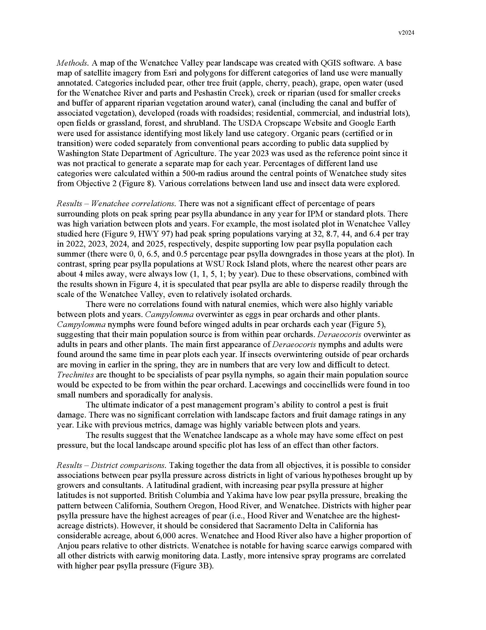 Summary: This project was designed to produce and share information that would help pear growers reduce chemical control costs while reducing damage of the key pest pear psylla by using an integrated pest management program (IPM) that conserves biocontrol. A survey was conducted and found that growers in Wenatchee used the most pesticides yet had the greatest pear psylla problem. An IPM program was designed for use in Wenatchee. It was built around a pear psylla phenology model for spray timings and a list of biocontrol-compatible spray options. The program was evaluated in commercial orchards from 2022–2025. The growers reduced spray costs in IPM plots in most years, but retained higher pesticide use than other districts through extensive applications of kaolin, azadirachtin, cinnamon oil, and other chemicals. The program resulted in similar pear psylla as standard programs. In Hood River and Yakima, growers meant to be trialing IPM programs ended up using blended programs that reduced but did not eliminate sprays excluded in the IPM guidelines, and outcomes were variable. Local and large-scale landscape factors were considered. Hood River pesticide use and pear psylla abundance was more similar to Wenatchee than we had assumed when the project was designed. Characteristics of Wenatchee and Hood River that may be associated with high pear psylla pressure relative to other districts includes high pesticide use (potential impairing biocontrol and causing pest resurgence), high pear acreage, and the Anjou cultivar. Notably, standard plots in Wenatchee generated very high overwintering pear psylla population in fall relative to IPM plots, but adult counts became similar between plots in spring. Overwintering pear psylla adults are known to be highly dispersive. It stands to reason that areawide adoption of IPM decreases pear psylla pressure across a district. An extensive program of field days, discussion groups, and newsletters shared data from the project, and adoption of IPM increased during the project. The survey and insect monitoring results here provide a conceptual basis for pear IPM and baseline data to compare with in the future.