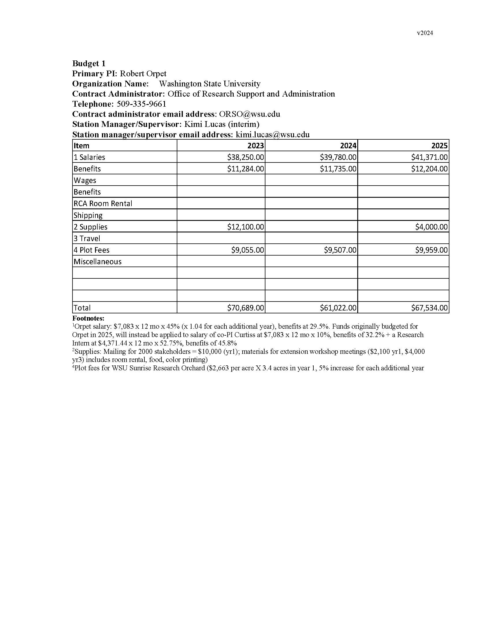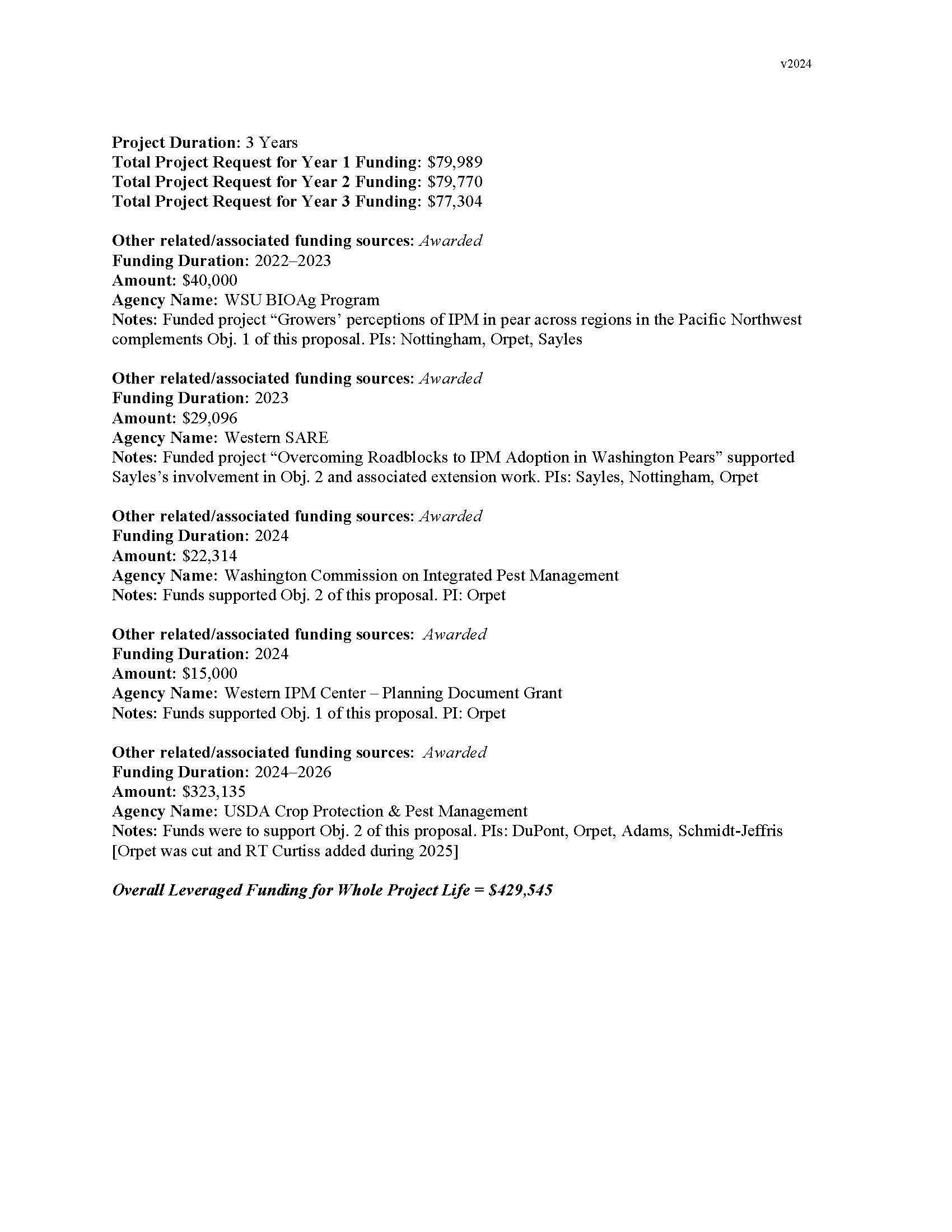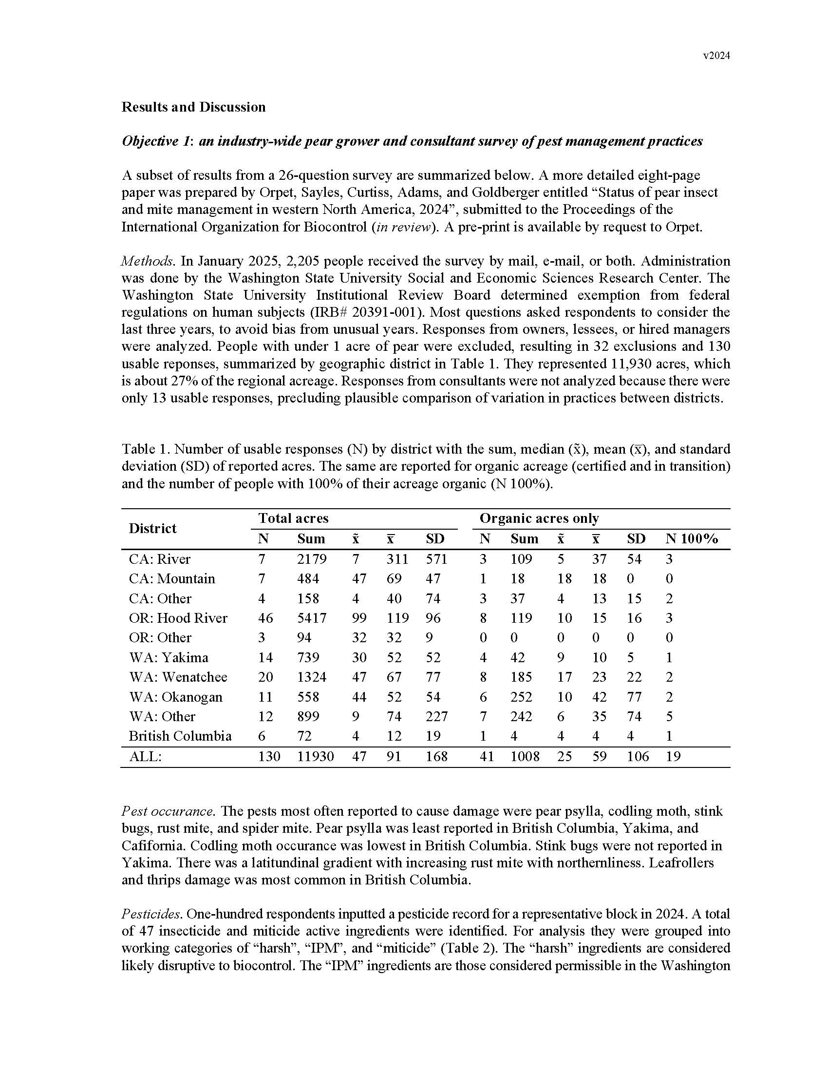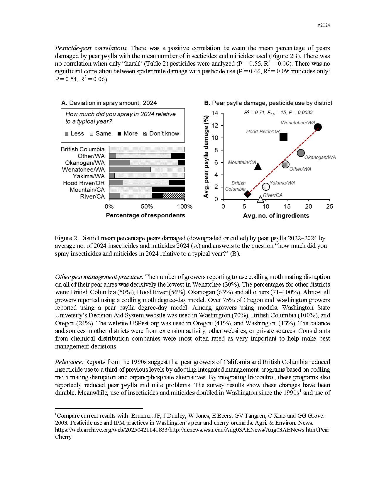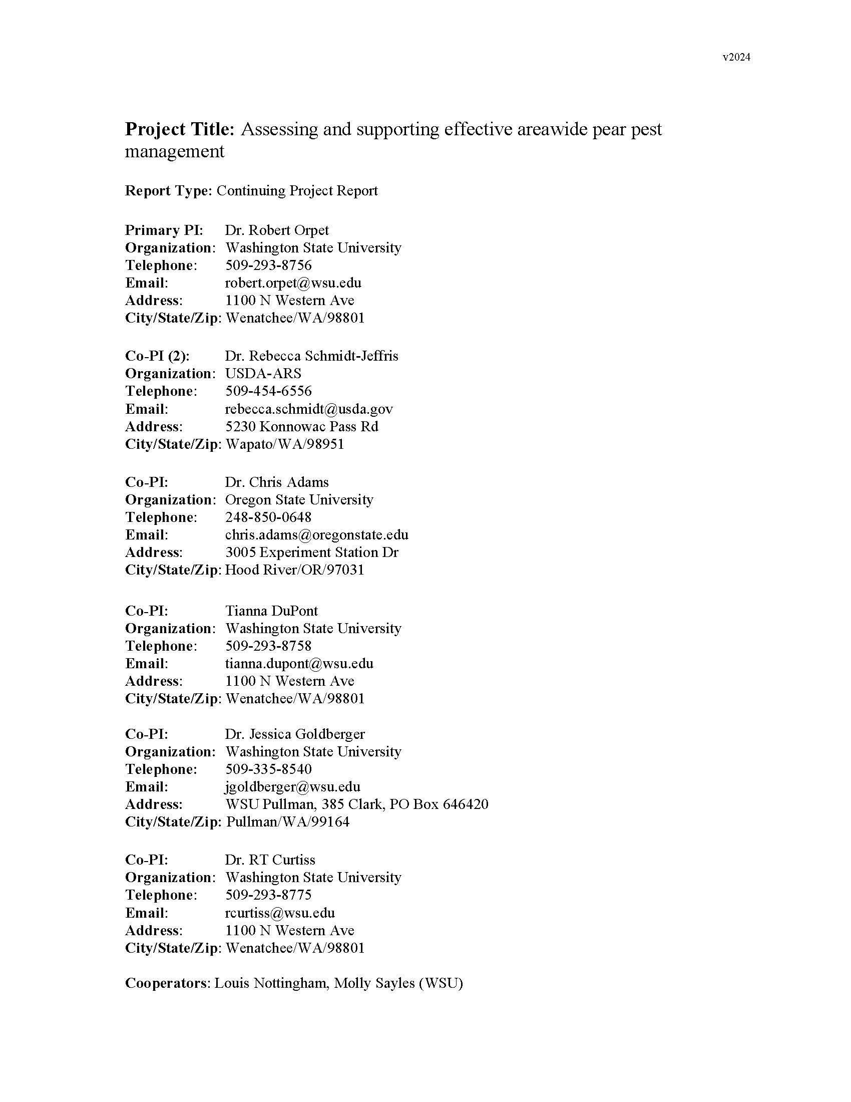 Summary: This project was designed to produce and share information that would help pear growers reduce chemical control costs while reducing damage of the key pest pear psylla by using an integrated pest management program (IPM) that conserves biocontrol. A survey was conducted and found that growers in Wenatchee used the most pesticides yet had the greatest pear psylla problem. An IPM program was designed for use in Wenatchee. It was built around a pear psylla phenology model for spray timings and a list of biocontrol-compatible spray options. The program was evaluated in commercial orchards from 2022–2025. The growers reduced spray costs in IPM plots in most years, but retained higher pesticide use than other districts through extensive applications of kaolin, azadirachtin, cinnamon oil, and other chemicals. The program resulted in similar pear psylla as standard programs. In Hood River and Yakima, growers meant to be trialing IPM programs ended up using blended programs that reduced but did not eliminate sprays excluded in the IPM guidelines, and outcomes were variable. Local and large-scale landscape factors were considered. Hood River pesticide use and pear psylla abundance was more similar to Wenatchee than we had assumed when the project was designed. Characteristics of Wenatchee and Hood River that may be associated with high pear psylla pressure relative to other districts includes high pesticide use (potential impairing biocontrol and causing pest resurgence), high pear acreage, and the Anjou cultivar. Notably, standard plots in Wenatchee generated very high overwintering pear psylla population in fall relative to IPM plots, but adult counts became similar between plots in spring. Overwintering pear psylla adults are known to be highly dispersive. It stands to reason that areawide adoption of IPM decreases pear psylla pressure across a district. An extensive program of field days, discussion groups, and newsletters shared data from the project, and adoption of IPM increased during the project. The survey and insect monitoring results here provide a conceptual basis for pear IPM and baseline data to compare with in the future.