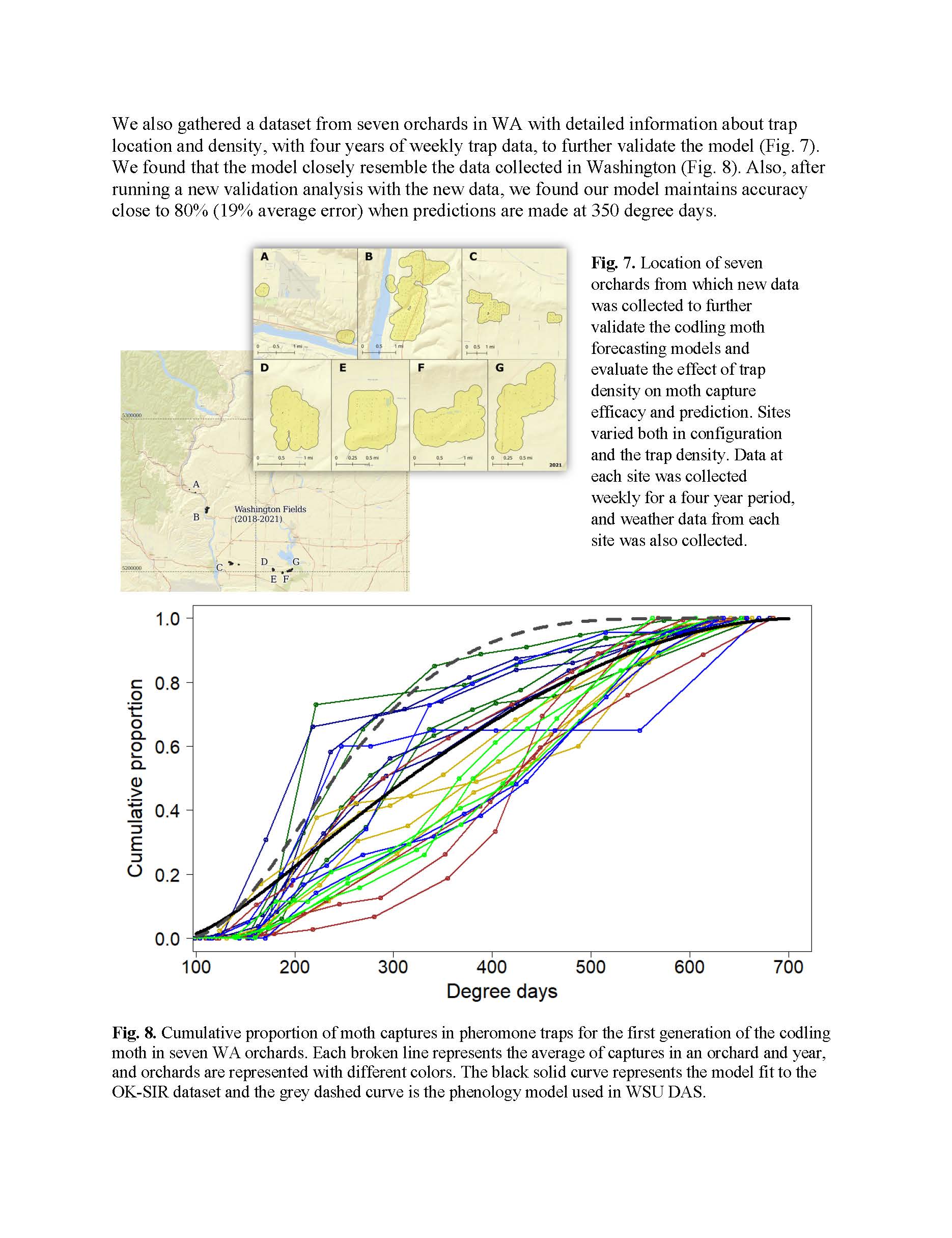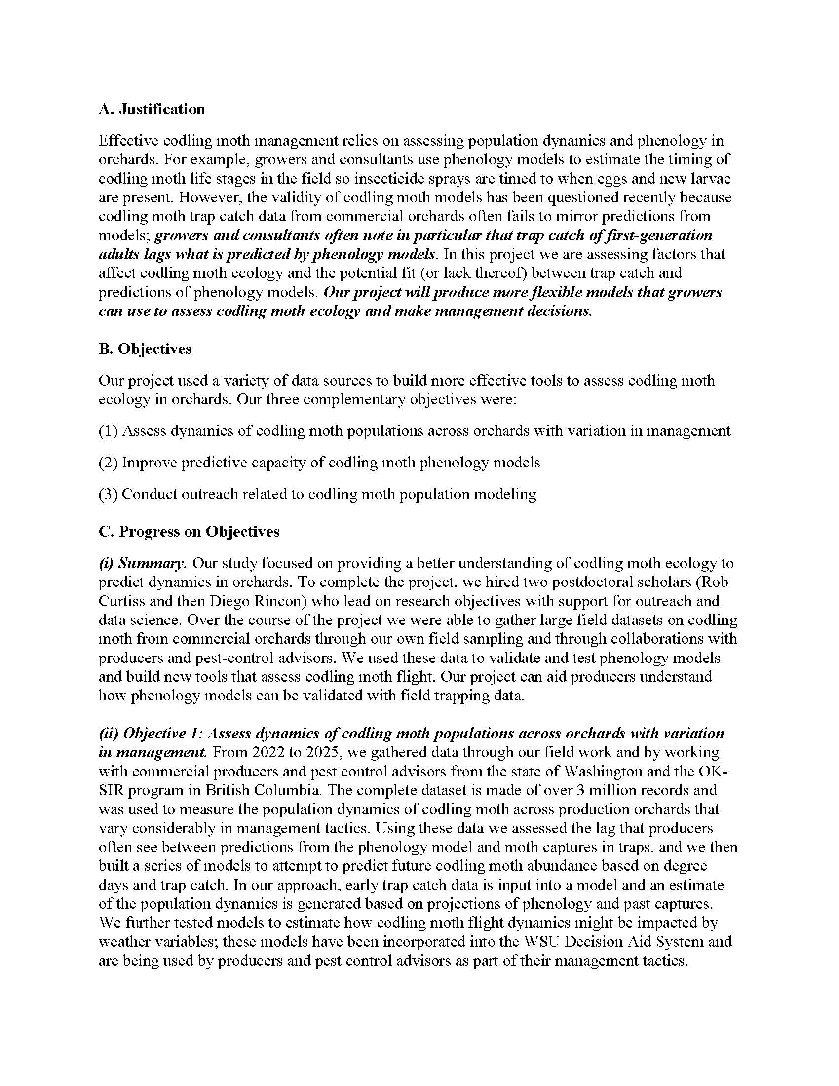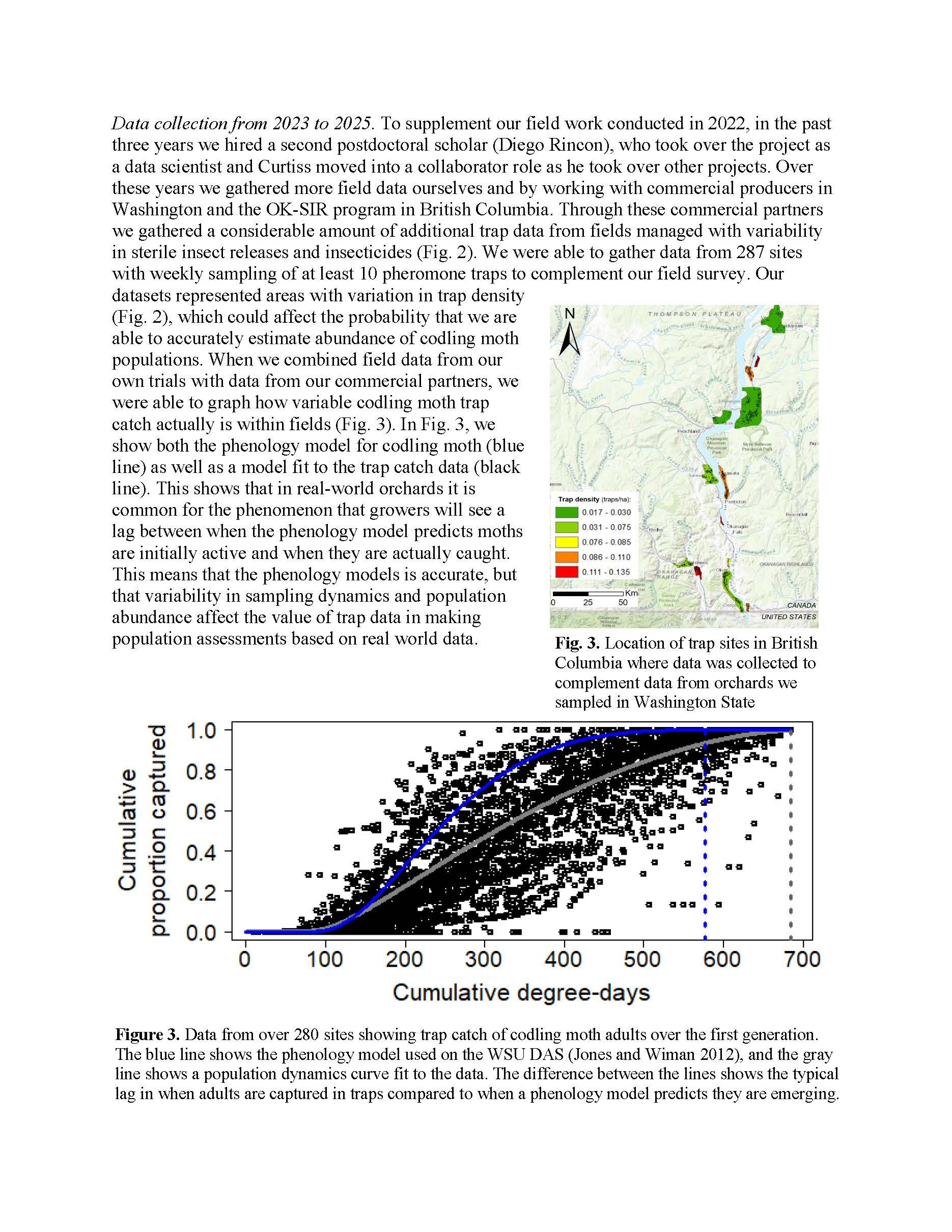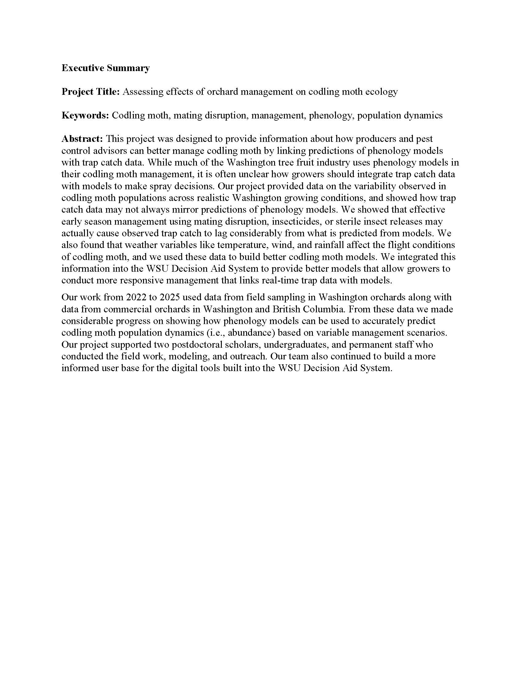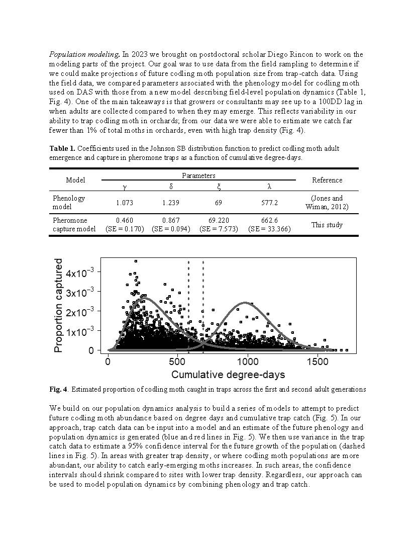 Summary: This project was designed to provide information about how producers and pest control advisors can better manage codling moth by linking predictions of phenology models with trap catch data. While much of the Washington tree fruit industry uses phenology models in their codling moth management, it is often unclear how growers should integrate trap catch data with models to make spray decisions. Our project provided data on the variability observed in codling moth populations across realistic Washington growing conditions, and showed how trap catch data may not always mirror predictions of phenology models. We showed that effective early season management using mating disruption, insecticides, or sterile insect releases may actually cause observed trap catch to lag considerably from what is predicted from models. We also found that weather variables like temperature, wind, and rainfall affect the flight conditions of codling moth, and we used these data to build better codling moth models. We integrated this information into the WSU Decision Aid System to provide better models that allow growers to conduct more responsive management that links real-time trap data with models. Our work from 2022 to 2025 used data from field sampling in Washington orchards along with data from commercial orchards in Washington and British Columbia. From these data we made considerable progress on showing how phenology models can be used to accurately predict codling moth population dynamics (i.e., abundance) based on variable management scenarios. Our project supported two postdoctoral scholars, undergraduates, and permanent staff who conducted the field work, modeling, and outreach. Our team also continued to build a more informed user base for the digital tools built into the WSU Decision Aid System.
