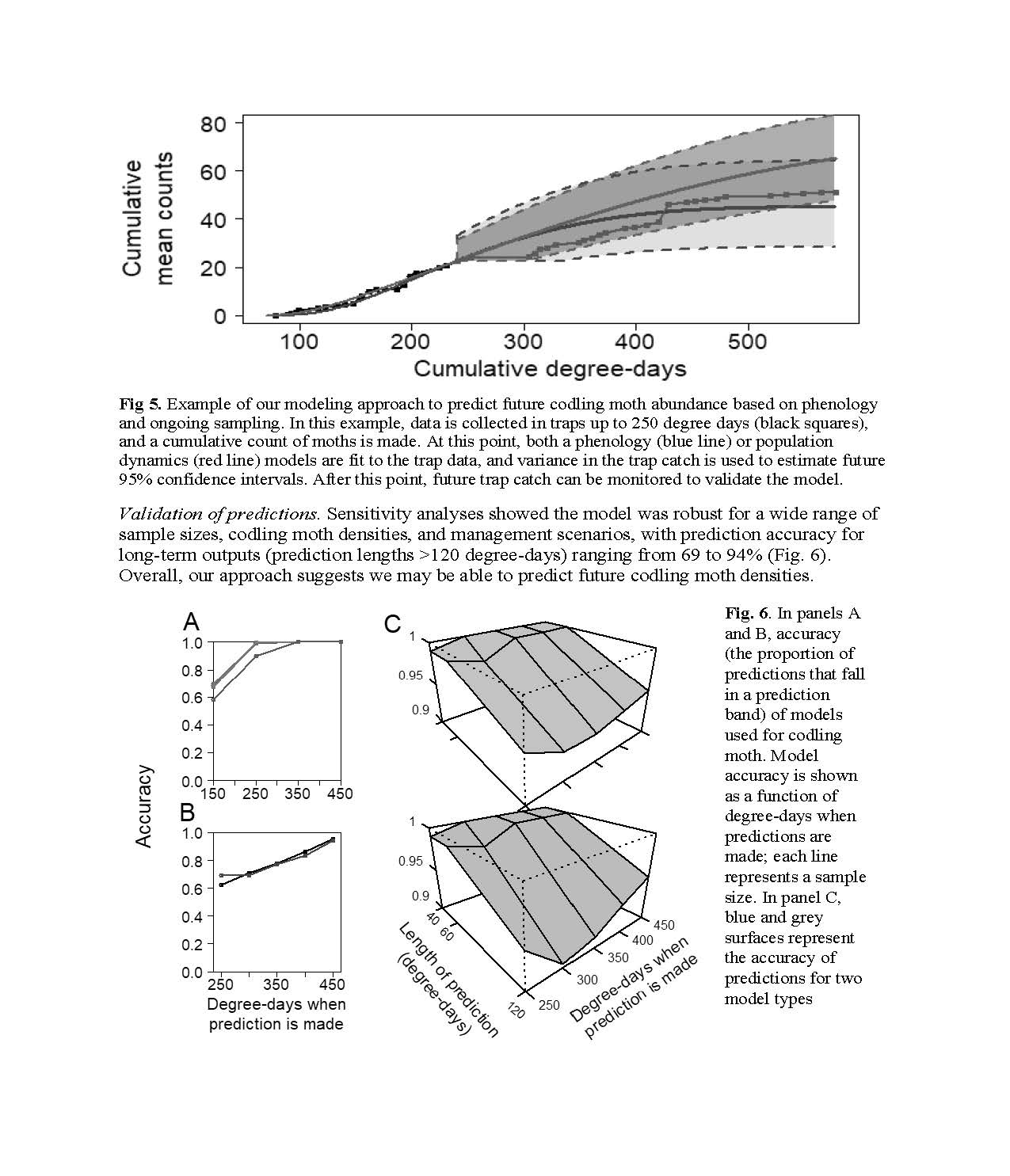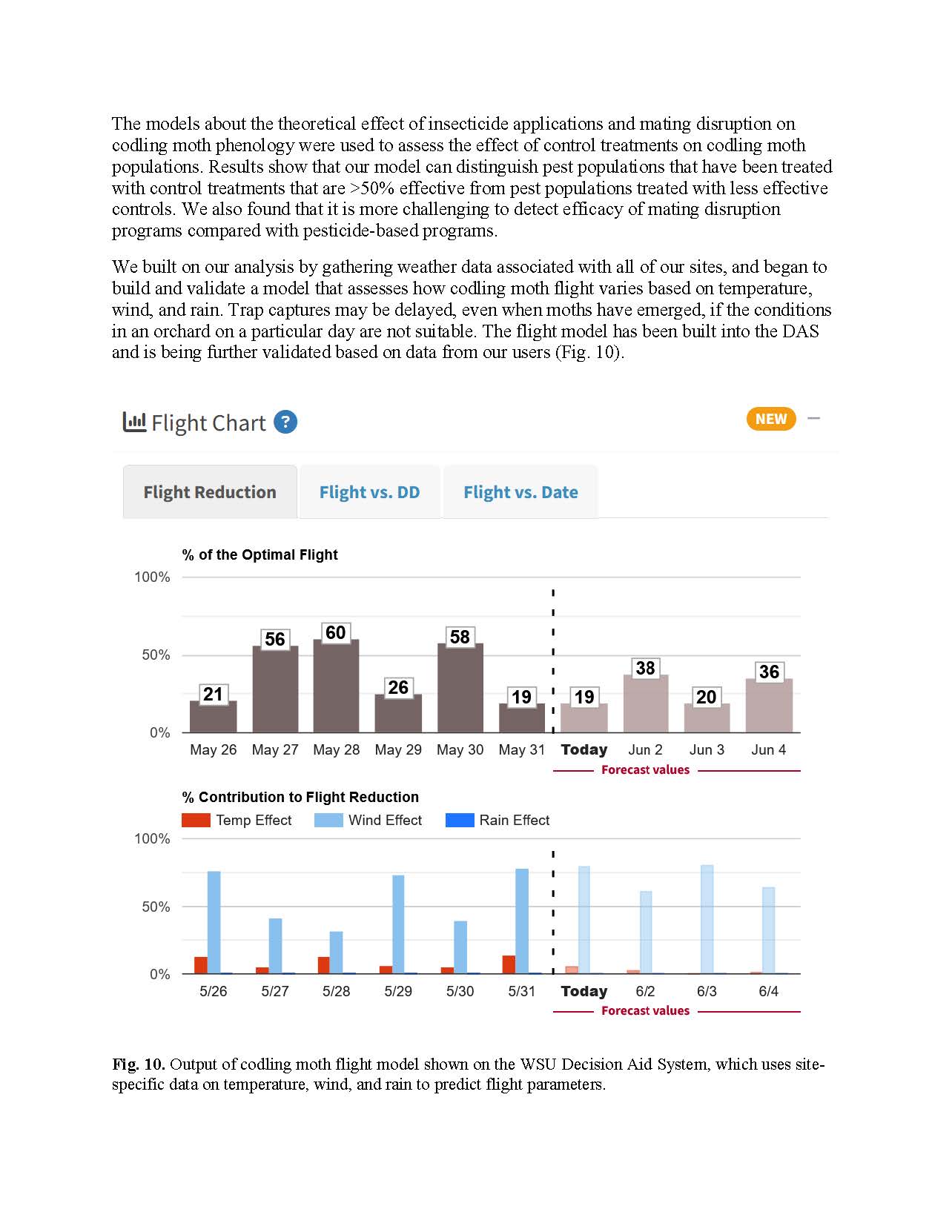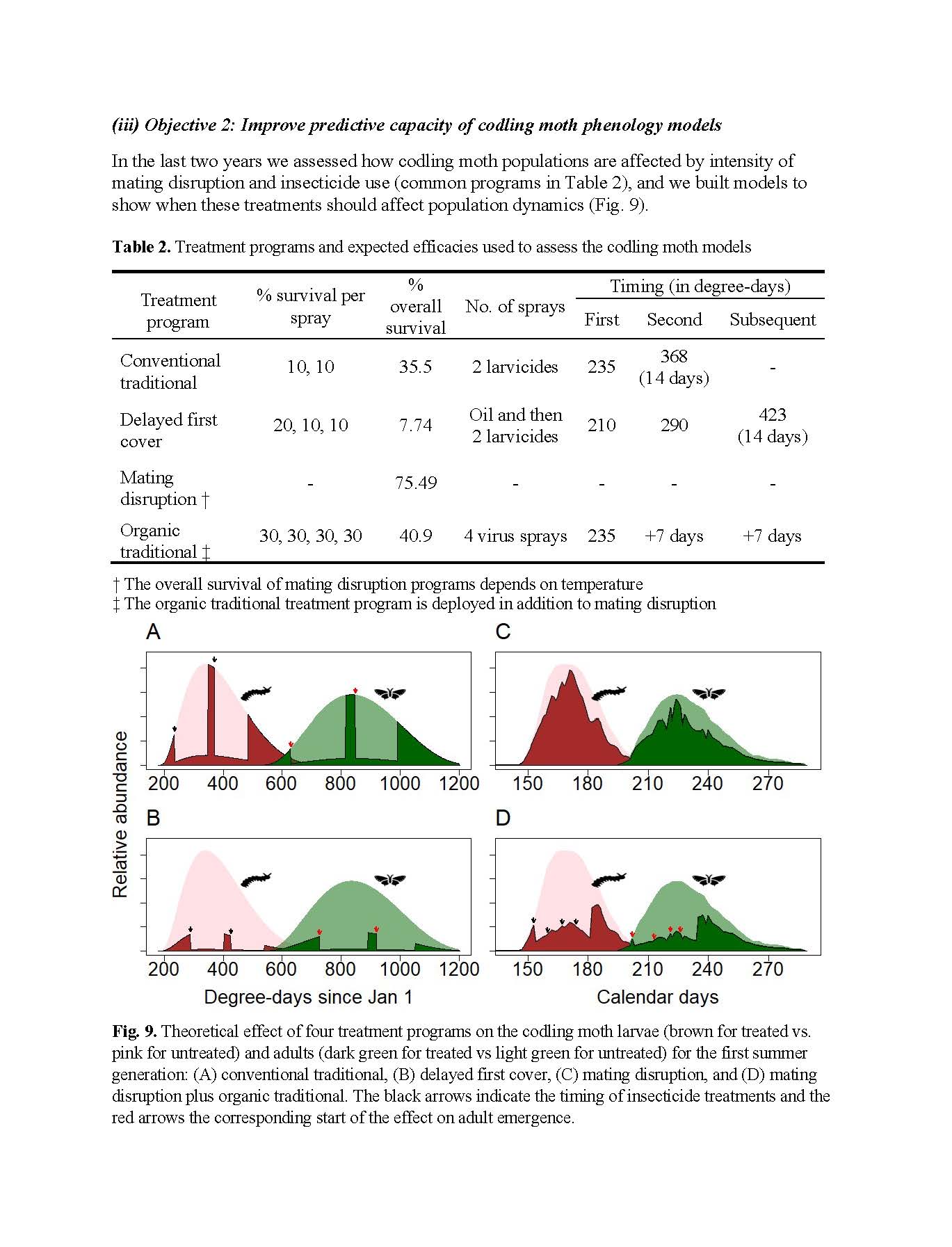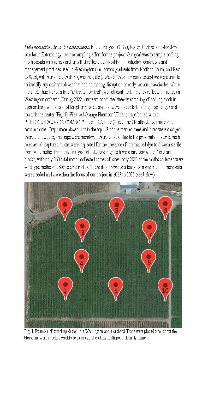 Summary: This project was designed to provide information about how producers and pest control advisors can better manage codling moth by linking predictions of phenology models with trap catch data. While much of the Washington tree fruit industry uses phenology models in their codling moth management, it is often unclear how growers should integrate trap catch data with models to make spray decisions. Our project provided data on the variability observed in codling moth populations across realistic Washington growing conditions, and showed how trap catch data may not always mirror predictions of phenology models. We showed that effective early season management using mating disruption, insecticides, or sterile insect releases may actually cause observed trap catch to lag considerably from what is predicted from models. We also found that weather variables like temperature, wind, and rainfall affect the flight conditions of codling moth, and we used these data to build better codling moth models. We integrated this information into the WSU Decision Aid System to provide better models that allow growers to conduct more responsive management that links real-time trap data with models. Our work from 2022 to 2025 used data from field sampling in Washington orchards along with data from commercial orchards in Washington and British Columbia. From these data we made considerable progress on showing how phenology models can be used to accurately predict codling moth population dynamics (i.e., abundance) based on variable management scenarios. Our project supported two postdoctoral scholars, undergraduates, and permanent staff who conducted the field work, modeling, and outreach. Our team also continued to build a more informed user base for the digital tools built into the WSU Decision Aid System.