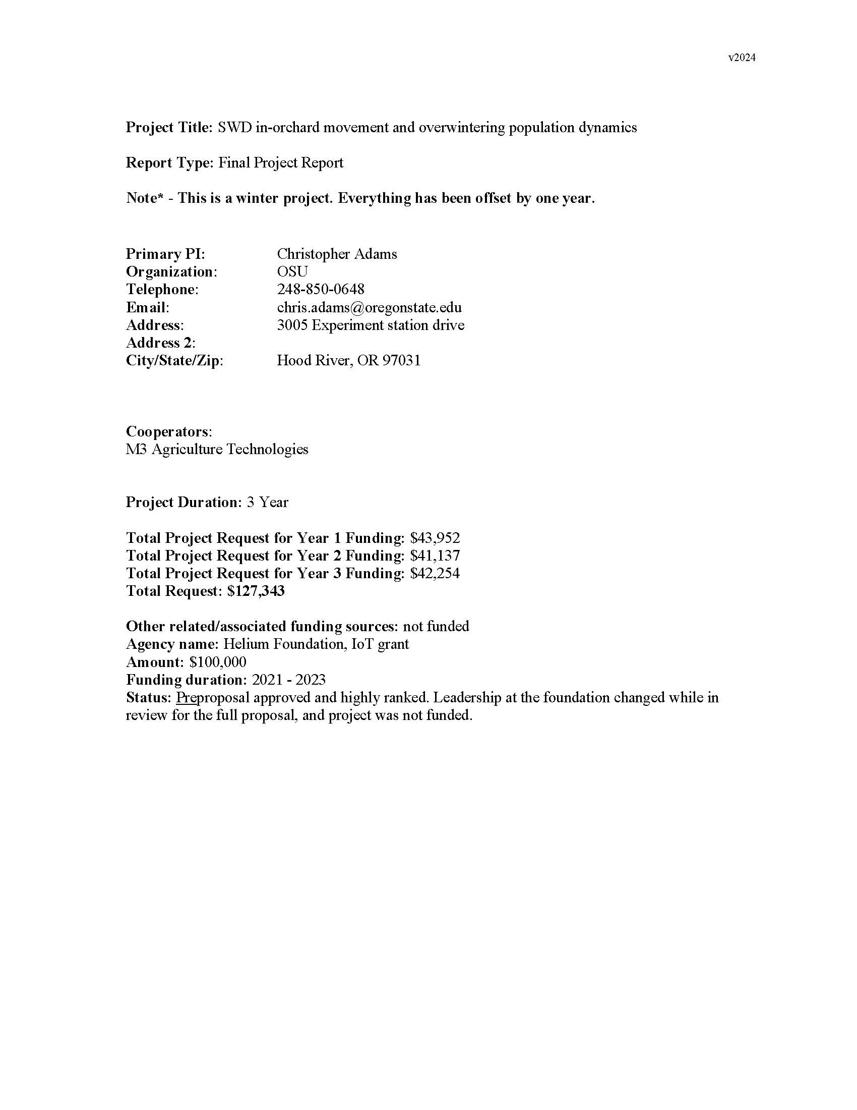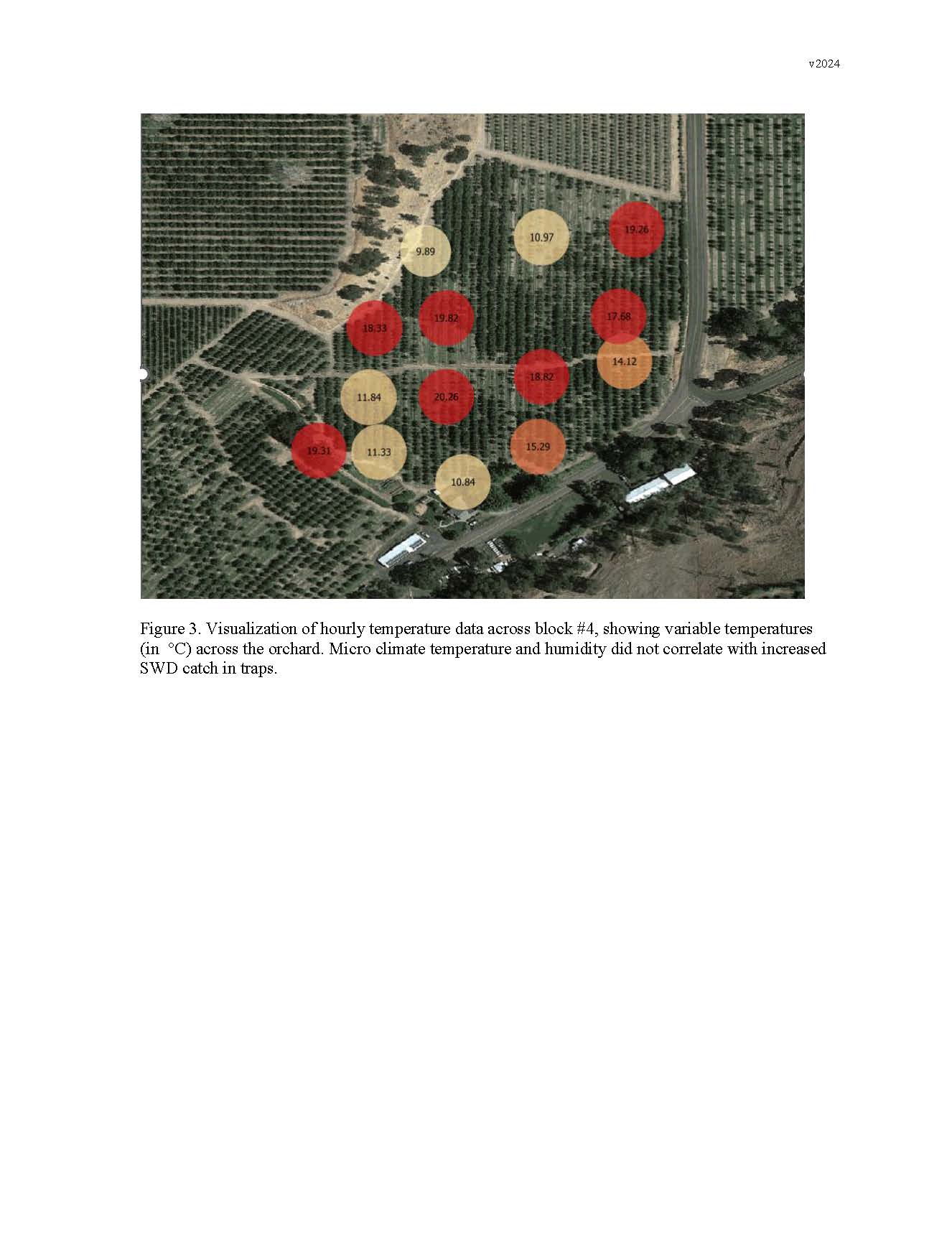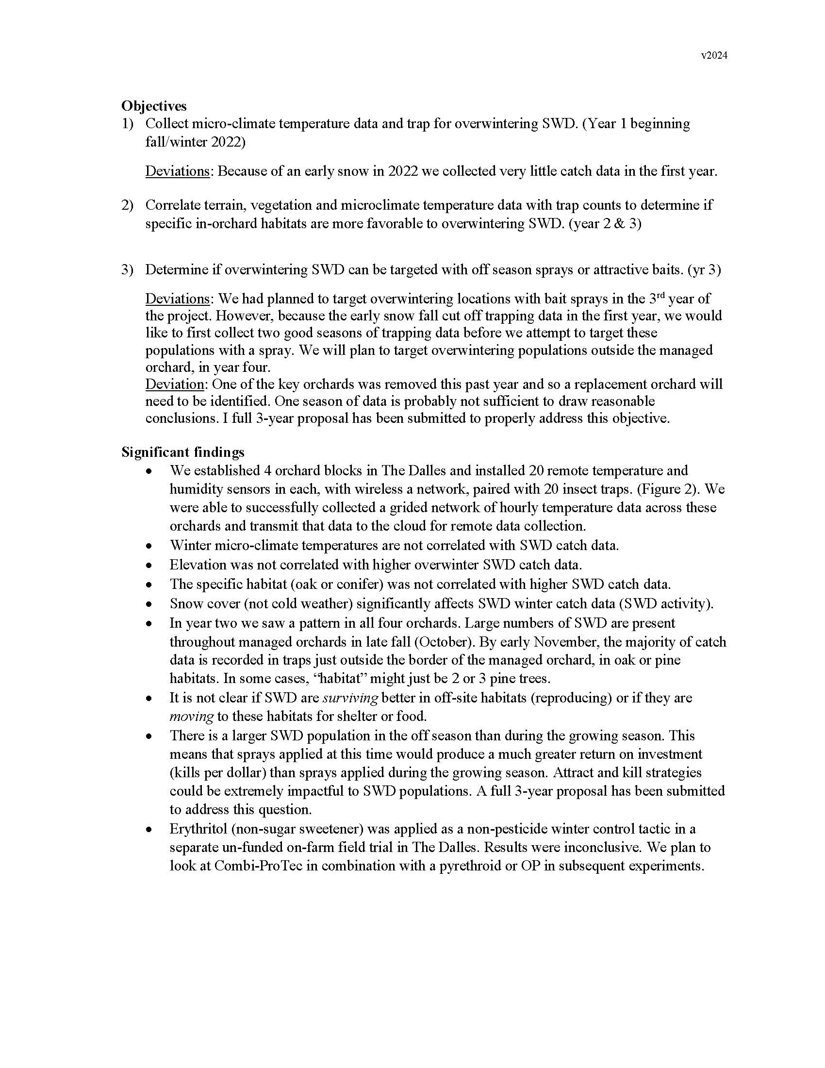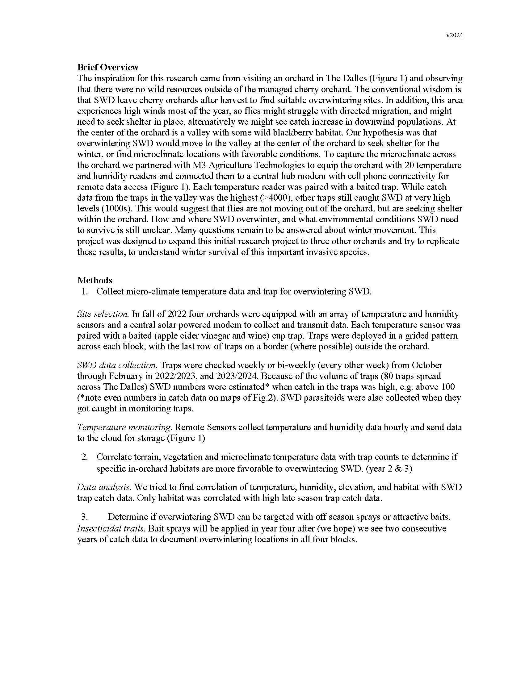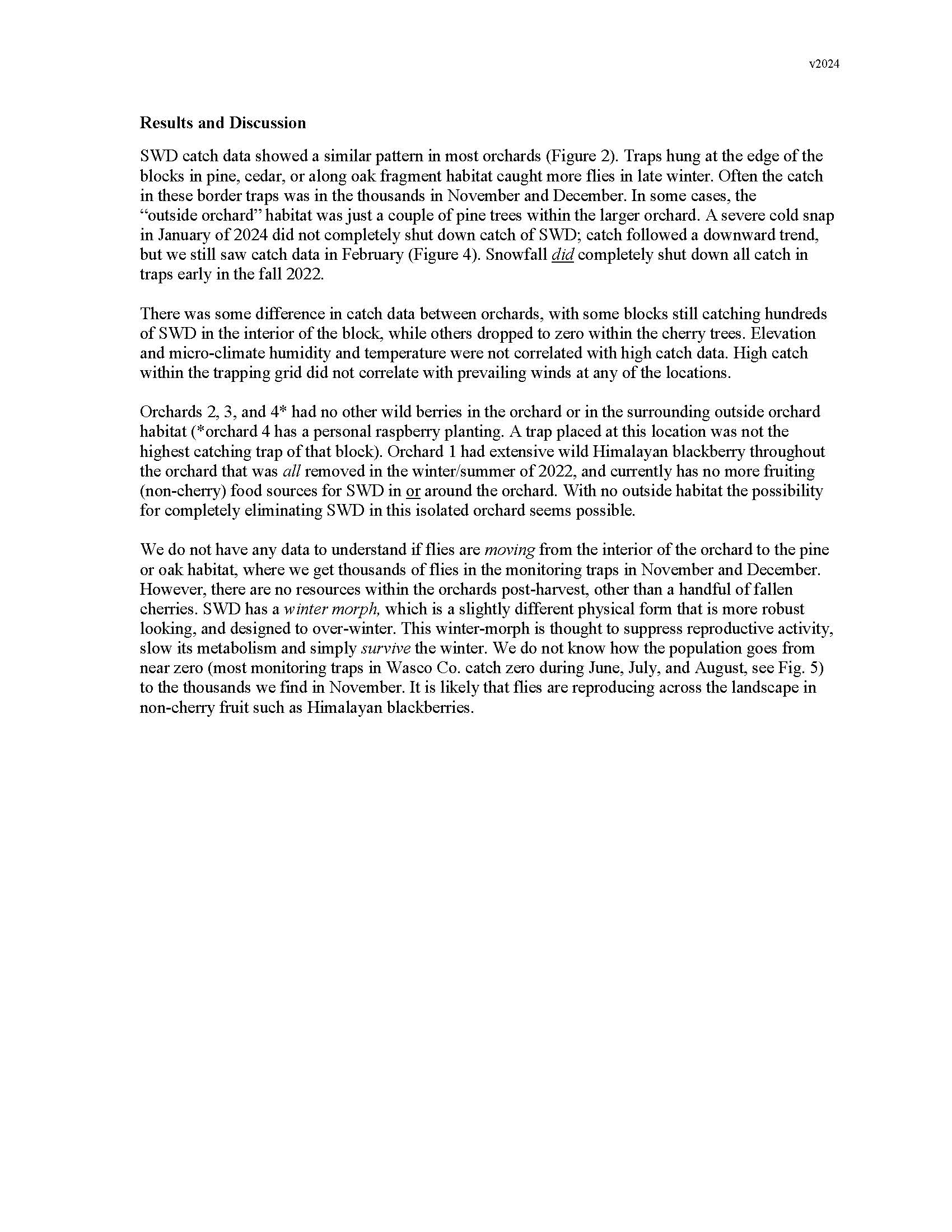 Summary: SWD catch data showed a similar pattern in most orchards (Figure 2). Traps hung at the edge of the blocks in pine, cedar, or along oak fragment habitat caught more flies in late winter. Often the catch in these border traps was in the thousands in November and December. In some cases, the “outside orchard” habitat was just a couple of pine trees within the larger orchard. A severe cold snap in January of 2024 did not completely shut down catch of SWD; catch followed a downward trend, but we still saw catch data in February (Figure 4). Snowfall did completely shut down all catch in traps early in the fall 2022. There was some difference in catch data between orchards, with some blocks still catching hundreds of SWD in the interior of the block, while others dropped to zero within the cherry trees. Elevation and micro-climate humidity and temperature were not correlated with high catch data. High catch within the trapping grid did not correlate with prevailing winds at any of the locations. Orchards 2, 3, and 4* had no other wild berries in the orchard or in the surrounding outside orchard habitat (*orchard 4 has a personal raspberry planting. A trap placed at this location was not the highest catching trap of that block). Orchard 1 had extensive wild Himalayan blackberry throughout the orchard that was all removed in the winter/summer of 2022, and currently has no more fruiting (non-cherry) food sources for SWD in or around the orchard. With no outside habitat the possibility for completely eliminating SWD in this isolated orchard seems possible. We do not have any data to understand if flies are moving from the interior of the orchard to the pine or oak habitat, where we get thousands of flies in the monitoring traps in November and December. However, there are no resources within the orchards post-harvest, other than a handful of fallen cherries. SWD has a winter morph, which is a slightly different physical form that is more robust looking, and designed to over-winter. This winter-morph is thought to suppress reproductive activity, slow its metabolism and simply survive the winter. We do not know how the population goes from near zero (most monitoring traps in Wasco Co. catch zero during June, July, and August, see Fig. 5) to the thousands we find in November. It is likely that flies are reproducing across the landscape in non-cherry fruit such as Himalayan blackberries.