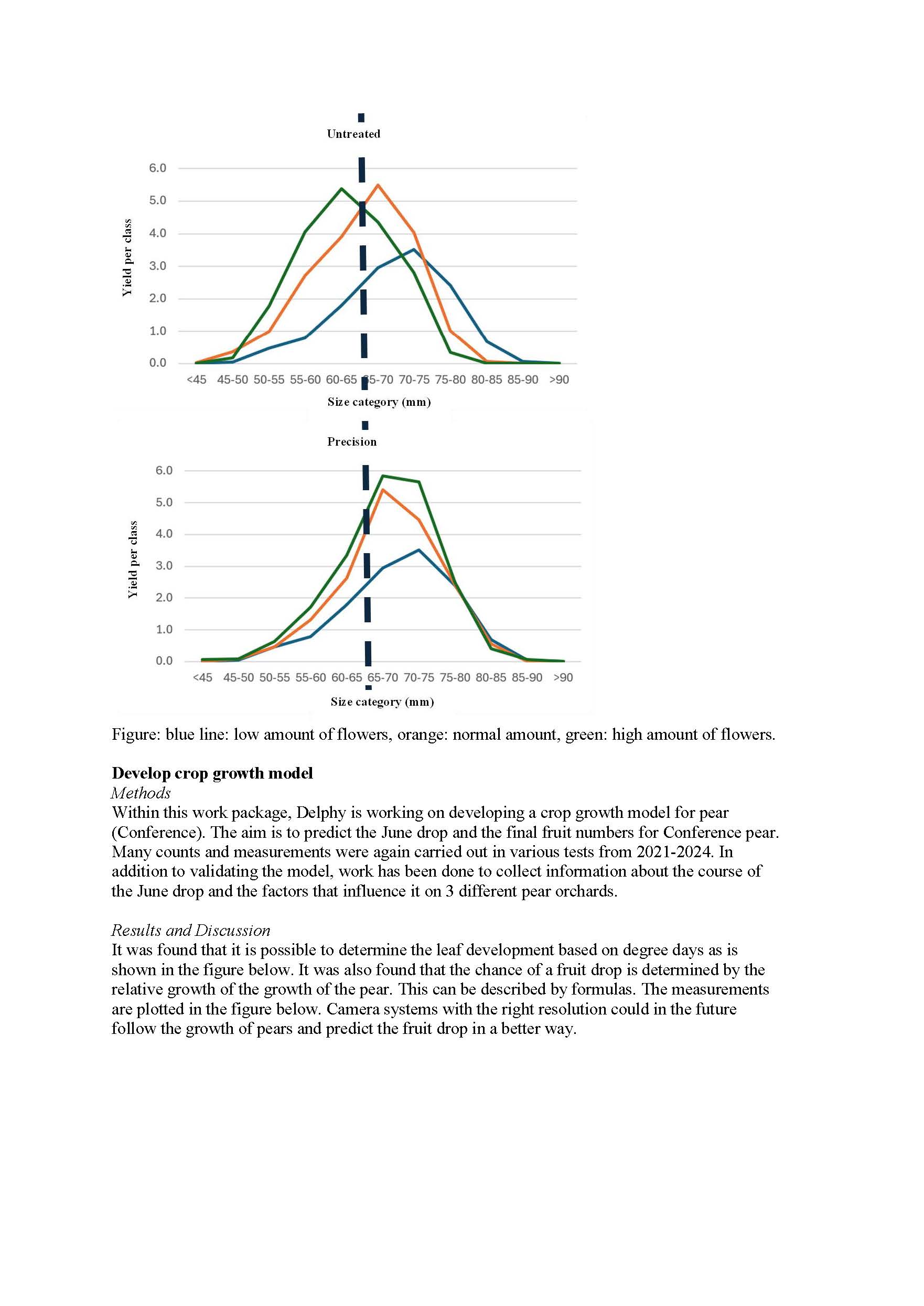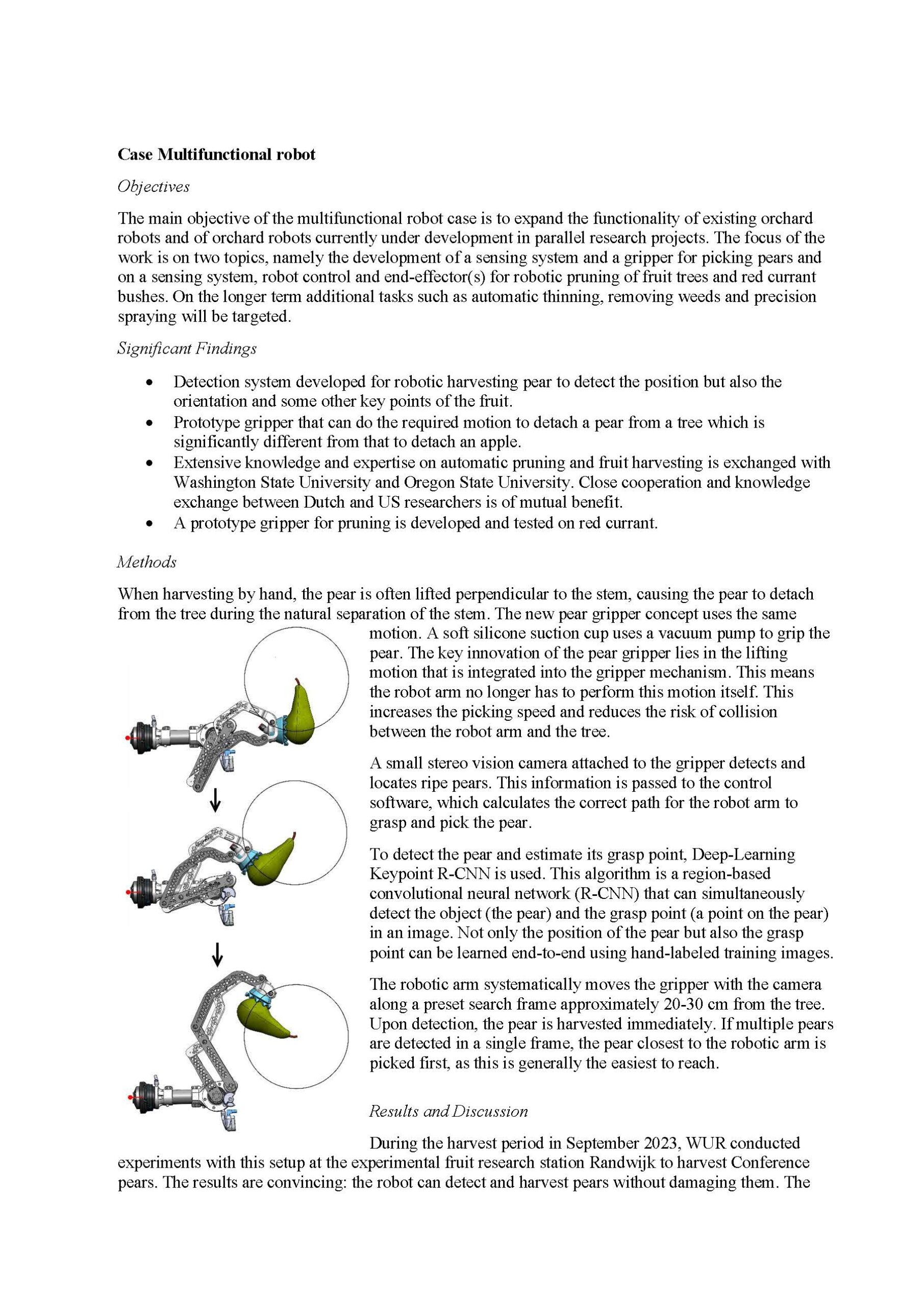 Summary: The object is to make fruit cultivation more efficient, intelligent, sustainable, and future-proof. A crucial step is to be able to monitor, manage, and to act at the level of individual trees with the help of smart technology. The first example is the development of a precision sprayer that can spray at a nozzle level with sensors that detect the volume of the trees. Two prototypes were build and one is commercially available for growers. A later add-on are RGB camera’s that can detect pests and diseases. For the detection of fruit tree canker the first algorithm was developed. Precision spraying during fruit thinning showed that aiming the trees with a high number of flowers gave the best effects on return bloom and that orchards will become more uniform. The second example is the development and or tests of sensor platforms that can detects blossoms and tree positions in the orchard or a platform that can examine the fruit quality of a storage bin. Specially for pear an algorithm was developed to measure the size. Colour measurements will follow in a follow-up project. The third example is the use of a non-destructive sensor to measure fruit quality like firmness and brix. The Fresco sensor showed reliable outcomes for both firmness as brix. And finally the fourth example is the build of end effectors for picking and pruning to make robots multifunctional. The first end effector to pick pears was made and tested with success in the field. This winter red currant plants will be pruned with the pruning end effector.