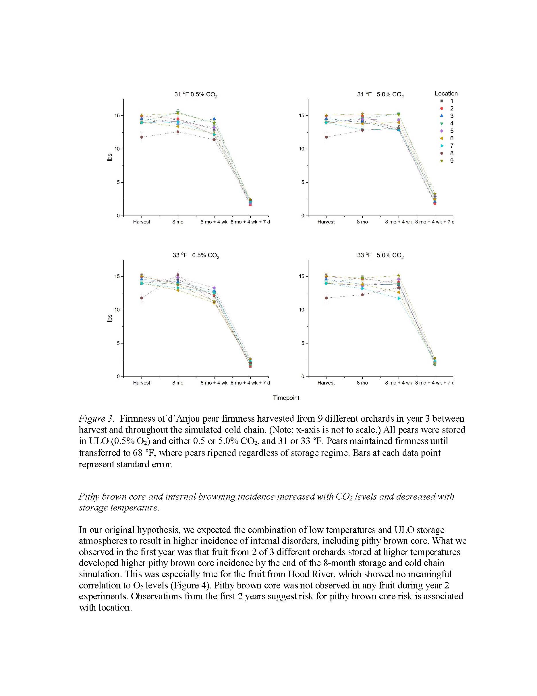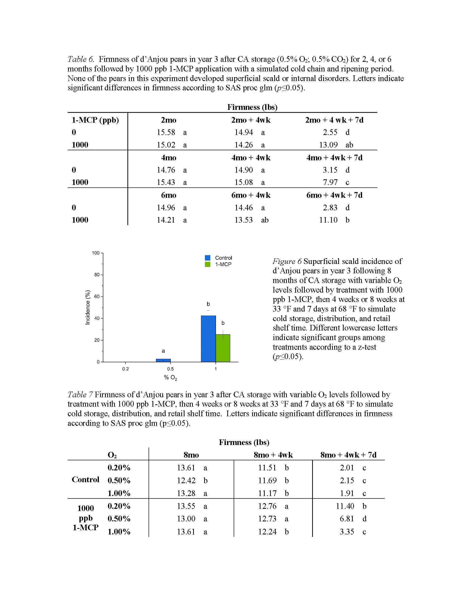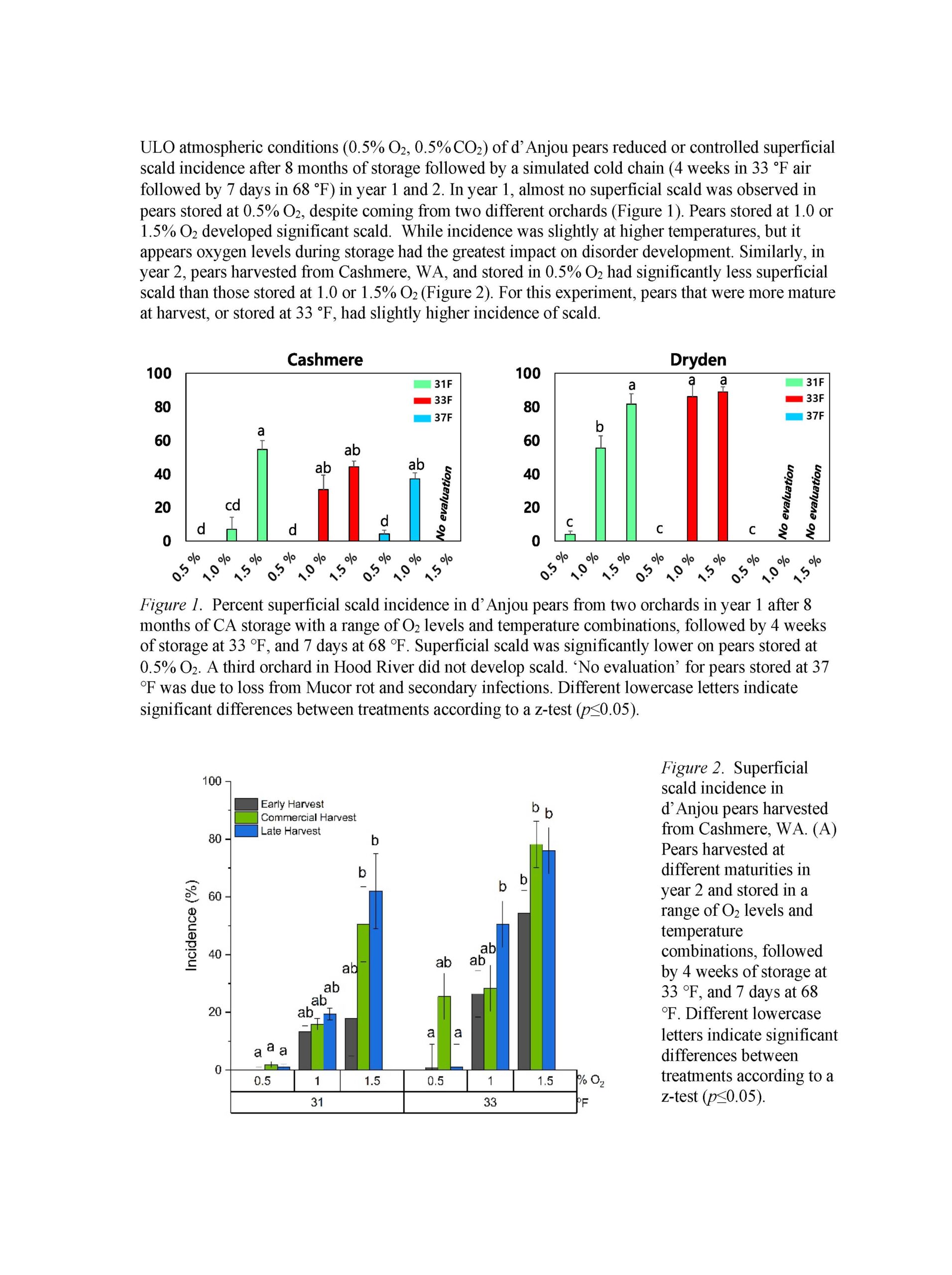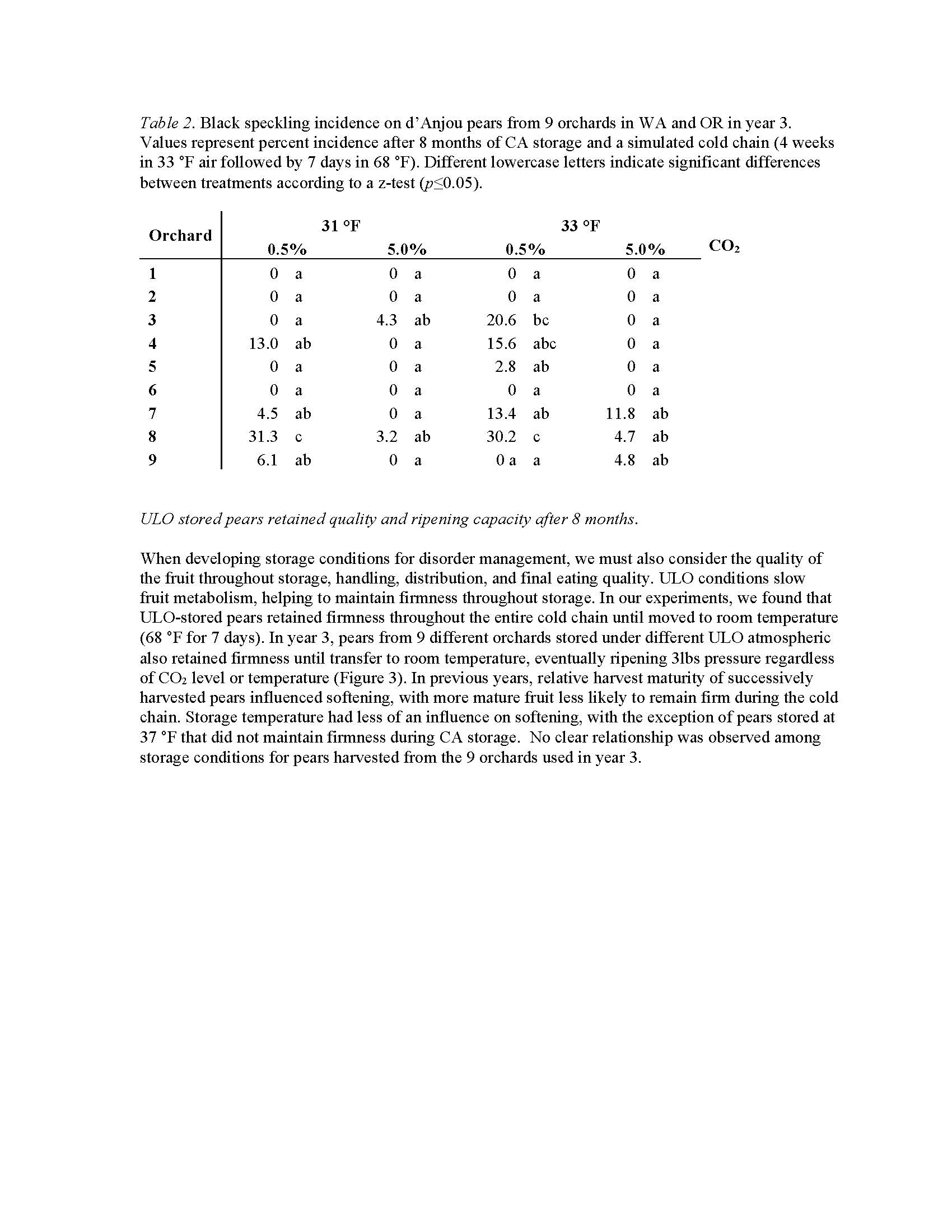 Summary: With diminishing market acceptability of ethoxyquin, new tools and strategies are required to control d’Anjou superficial scald that do not have negative impacts on eating quality. We evaluated combinations of ULO CA storage, storage temperatures, and post-storage 1-MCP treatment with the expectation of controlling superficial scald at warmer storage temperatures without consequential CO2-related disorder or black speckling incidence. Superficial scald was reduced or controlled by ULO CA depending in most cases. Pithy brown core and internal browning were particularly severe in Year 3 when pears were stored in elevated CO2 (0.5% O2; 5% CO2). Black speckling also developed on pears from some orchards in Year 3. Incidence of both black speckling and superficial scald was suppressed by atmospheres comprising elevated CO2. Warmer storage temperatures resulted in poorer scald and black speckling control but improved pithy brown core and internal browning reduction. Post-CA storage 1-MCP treatment, considering CA O2 levels and storage duration for dosage, both reduced scald and ripening while pears still retained ripening capacity. Results highlight further guidelines to use ULO in crop protectant restricted cold chains or post-storage 1-MCP treatment to suppress quality loss while retaining ripening capacity.