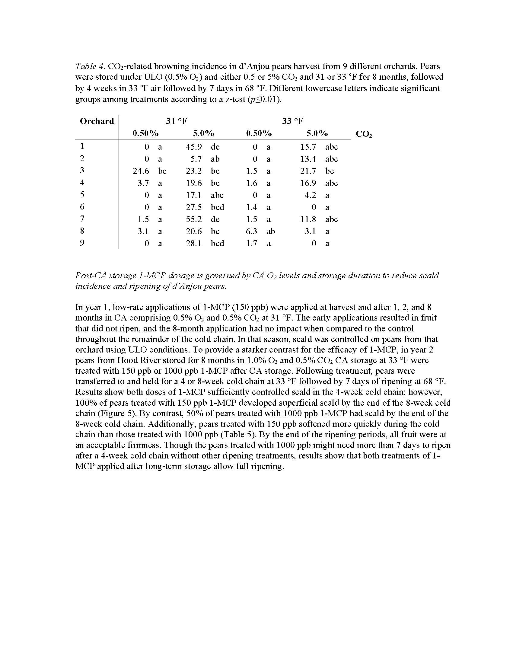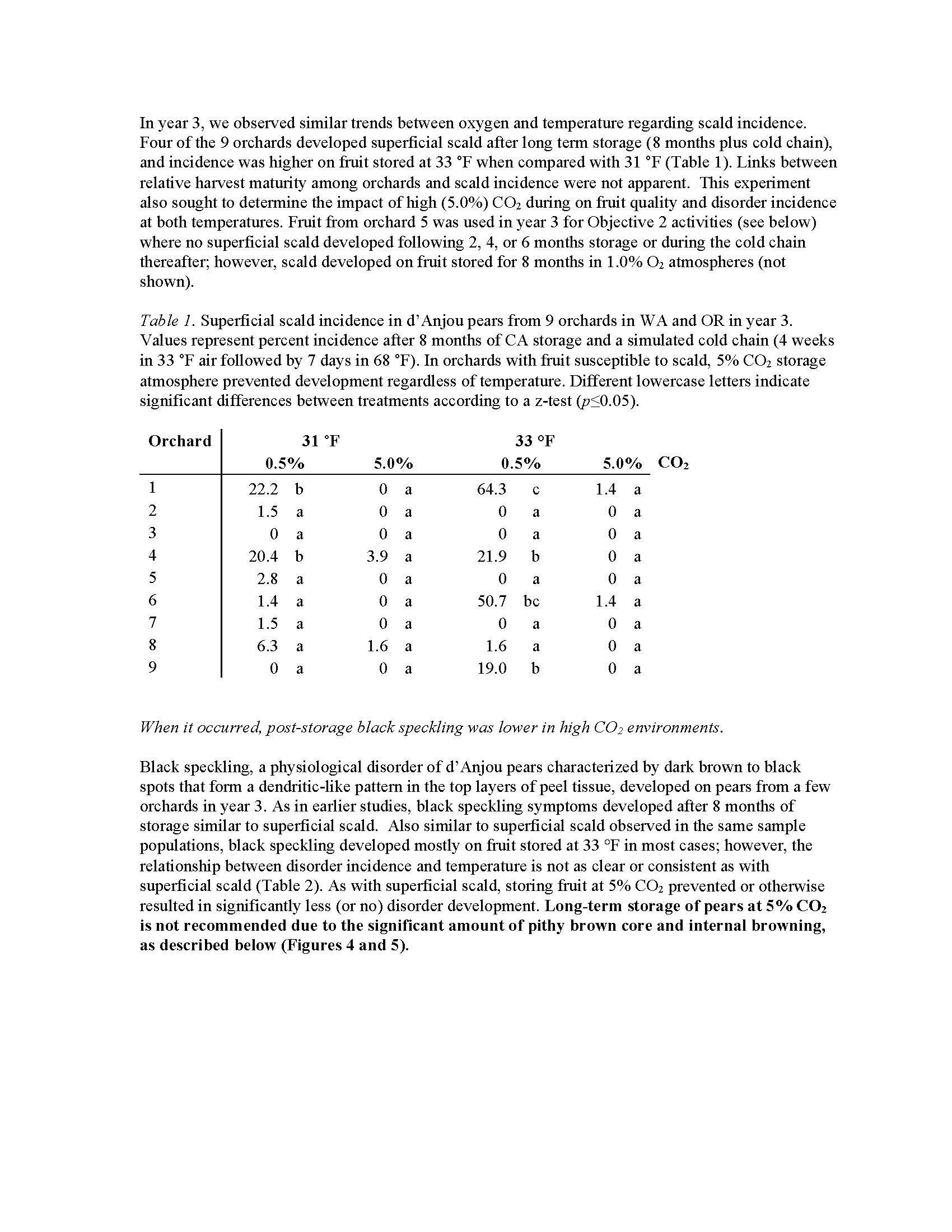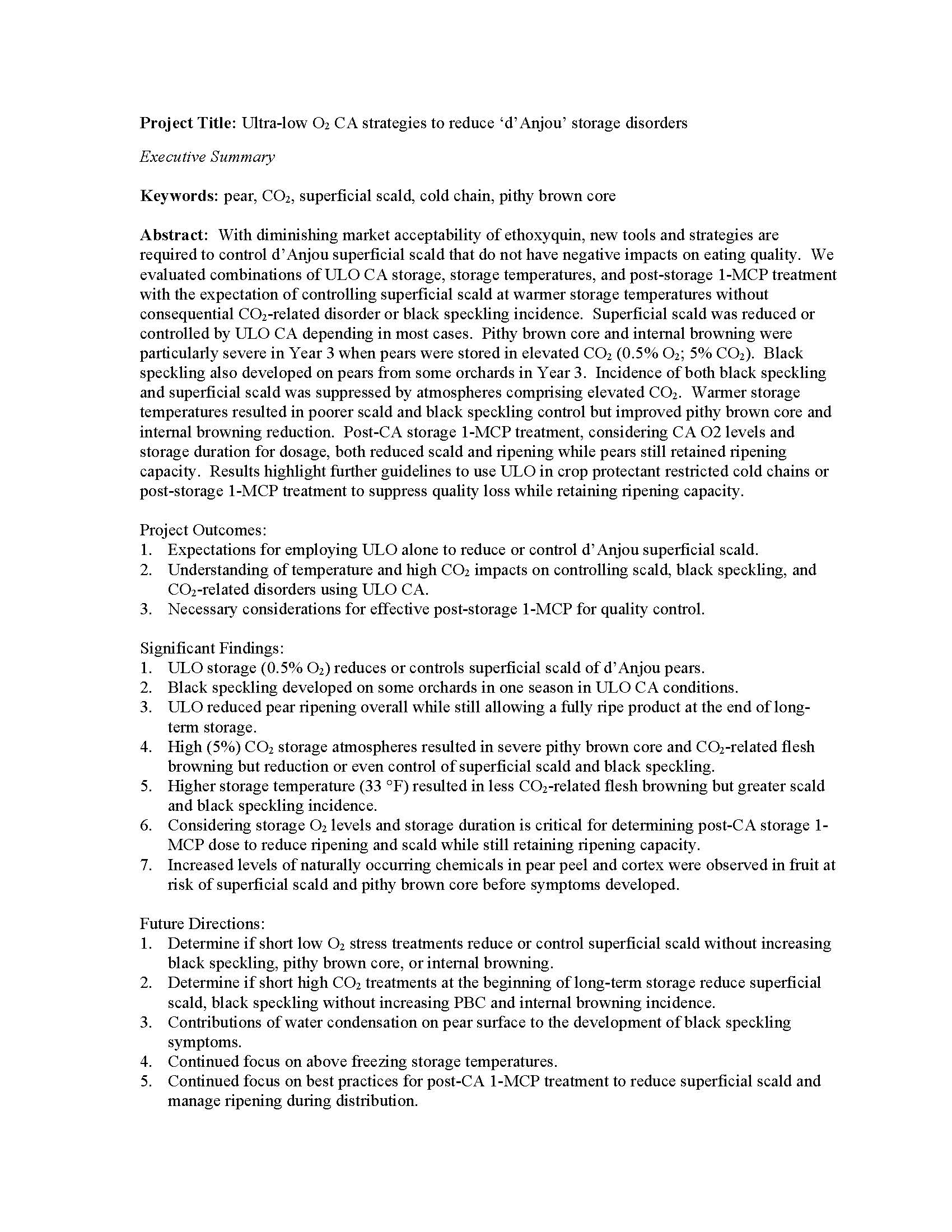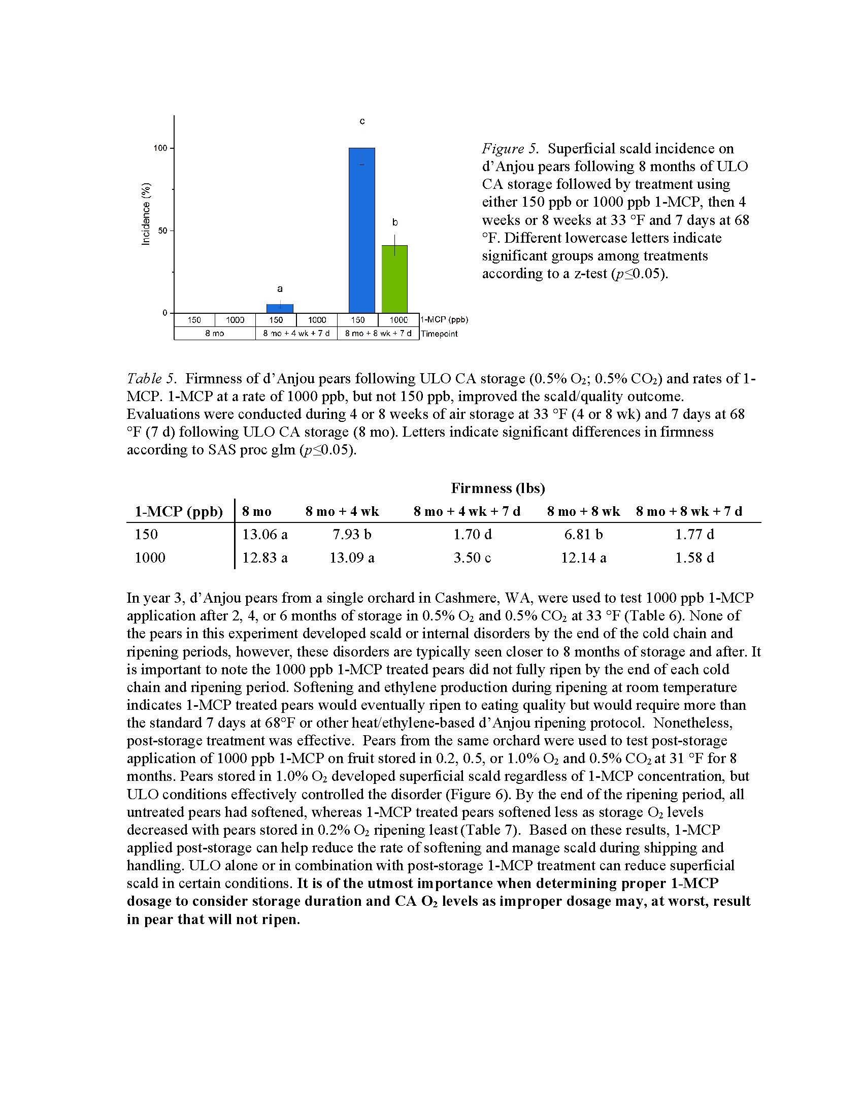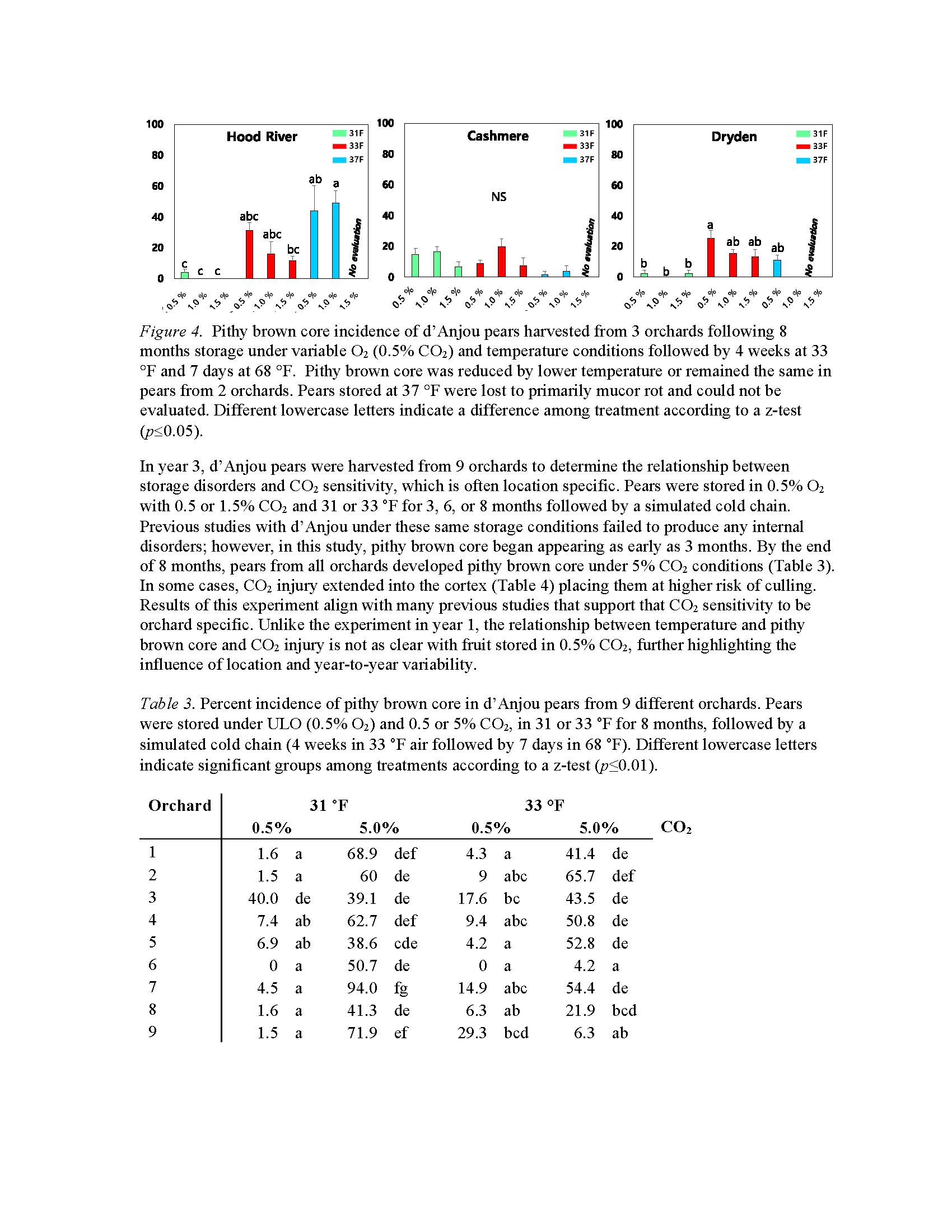 Summary: With diminishing market acceptability of ethoxyquin, new tools and strategies are required to control d’Anjou superficial scald that do not have negative impacts on eating quality. We evaluated combinations of ULO CA storage, storage temperatures, and post-storage 1-MCP treatment with the expectation of controlling superficial scald at warmer storage temperatures without consequential CO2-related disorder or black speckling incidence. Superficial scald was reduced or controlled by ULO CA depending in most cases. Pithy brown core and internal browning were particularly severe in Year 3 when pears were stored in elevated CO2 (0.5% O2; 5% CO2). Black speckling also developed on pears from some orchards in Year 3. Incidence of both black speckling and superficial scald was suppressed by atmospheres comprising elevated CO2. Warmer storage temperatures resulted in poorer scald and black speckling control but improved pithy brown core and internal browning reduction. Post-CA storage 1-MCP treatment, considering CA O2 levels and storage duration for dosage, both reduced scald and ripening while pears still retained ripening capacity. Results highlight further guidelines to use ULO in crop protectant restricted cold chains or post-storage 1-MCP treatment to suppress quality loss while retaining ripening capacity.