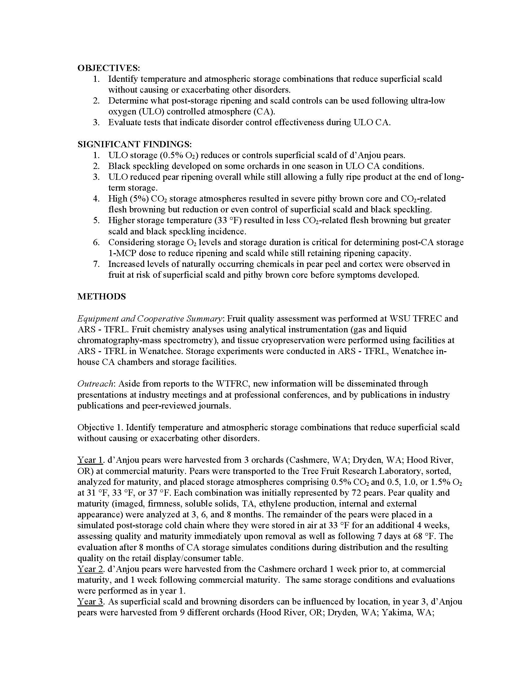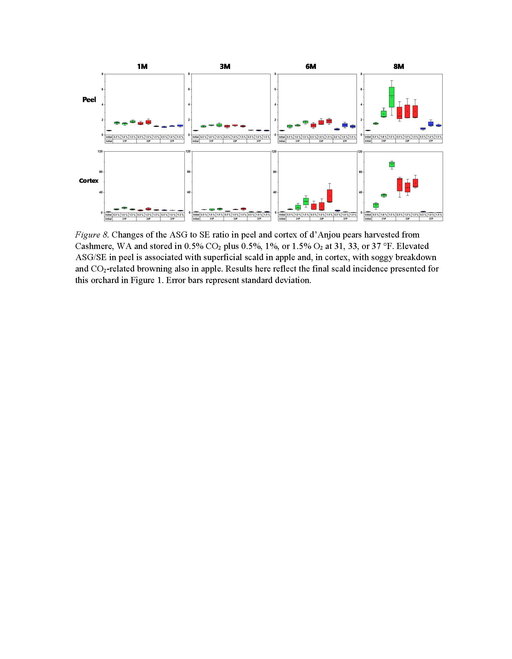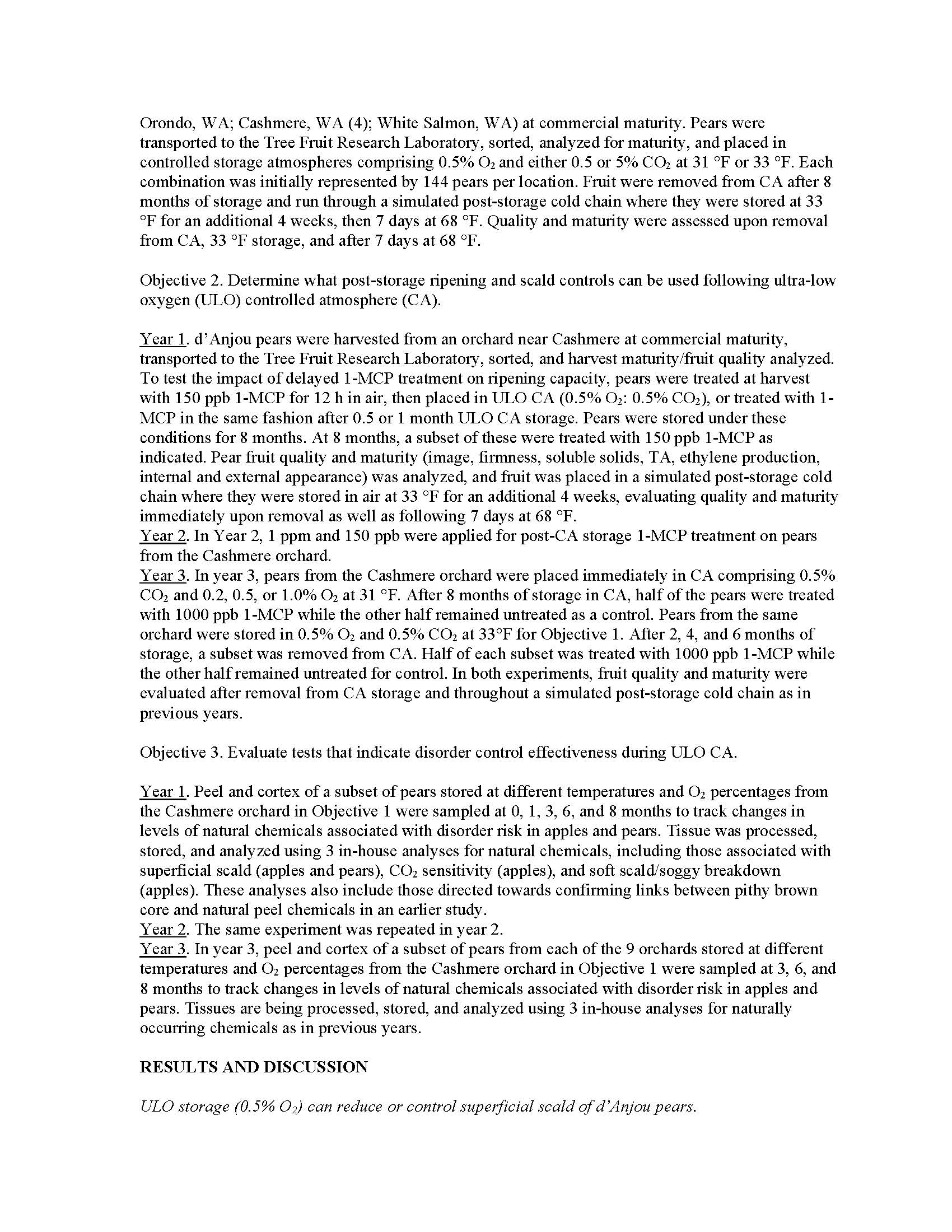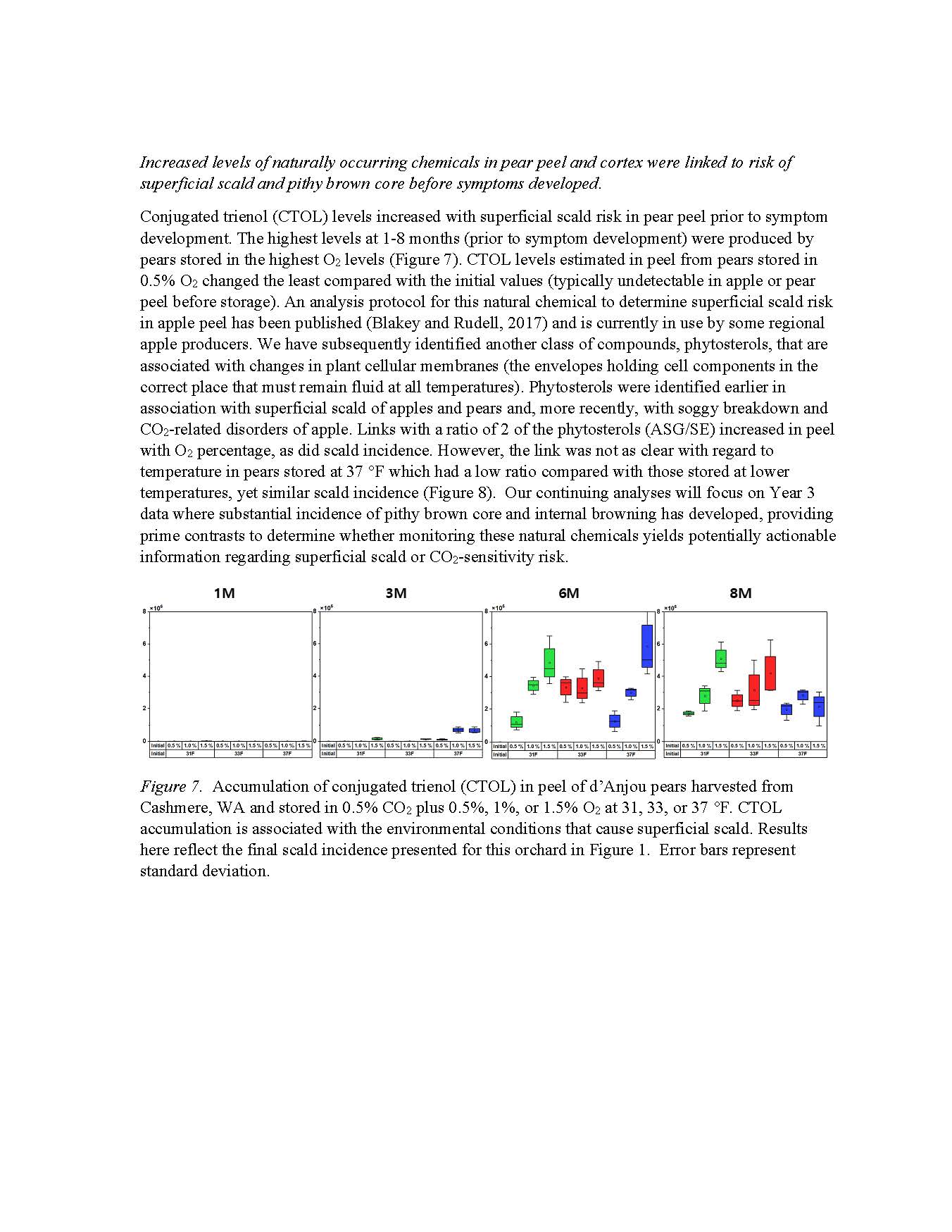 Summary: With diminishing market acceptability of ethoxyquin, new tools and strategies are required to control d’Anjou superficial scald that do not have negative impacts on eating quality. We evaluated combinations of ULO CA storage, storage temperatures, and post-storage 1-MCP treatment with the expectation of controlling superficial scald at warmer storage temperatures without consequential CO2-related disorder or black speckling incidence. Superficial scald was reduced or controlled by ULO CA depending in most cases. Pithy brown core and internal browning were particularly severe in Year 3 when pears were stored in elevated CO2 (0.5% O2; 5% CO2). Black speckling also developed on pears from some orchards in Year 3. Incidence of both black speckling and superficial scald was suppressed by atmospheres comprising elevated CO2. Warmer storage temperatures resulted in poorer scald and black speckling control but improved pithy brown core and internal browning reduction. Post-CA storage 1-MCP treatment, considering CA O2 levels and storage duration for dosage, both reduced scald and ripening while pears still retained ripening capacity. Results highlight further guidelines to use ULO in crop protectant restricted cold chains or post-storage 1-MCP treatment to suppress quality loss while retaining ripening capacity.